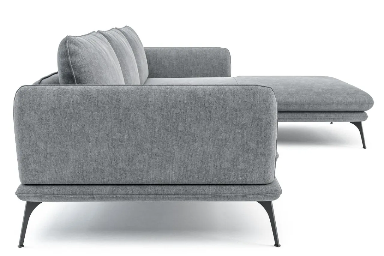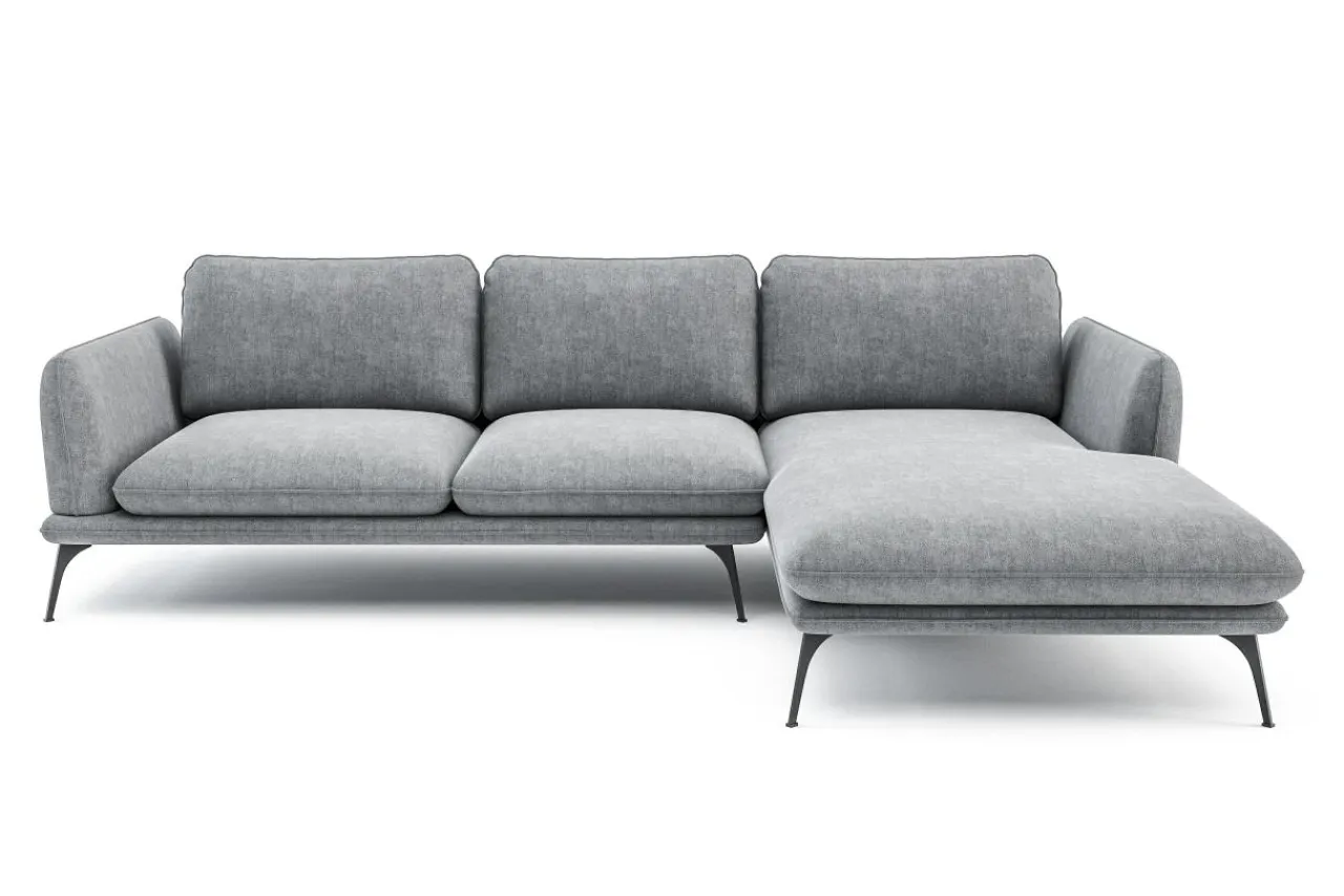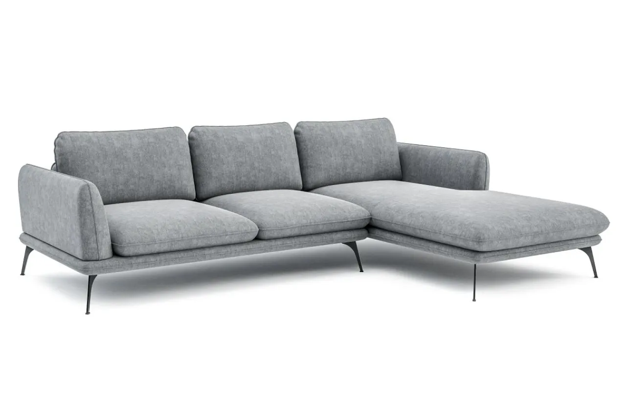 Narożnik pokryto szarą tkaniną welurową. Jej miękkość sprawi, że przybywanie w salonie będzie jeszcze przyjemniejsze.