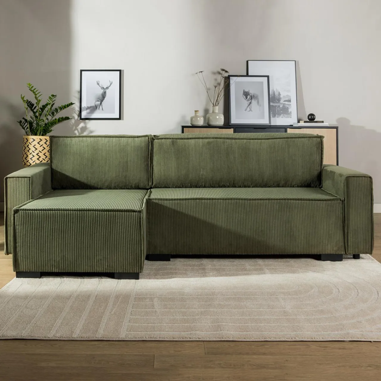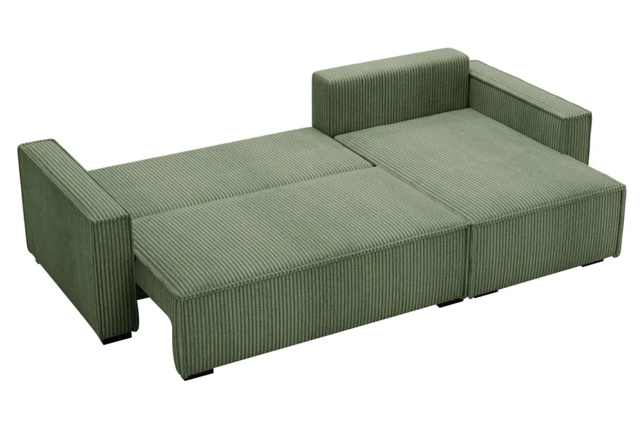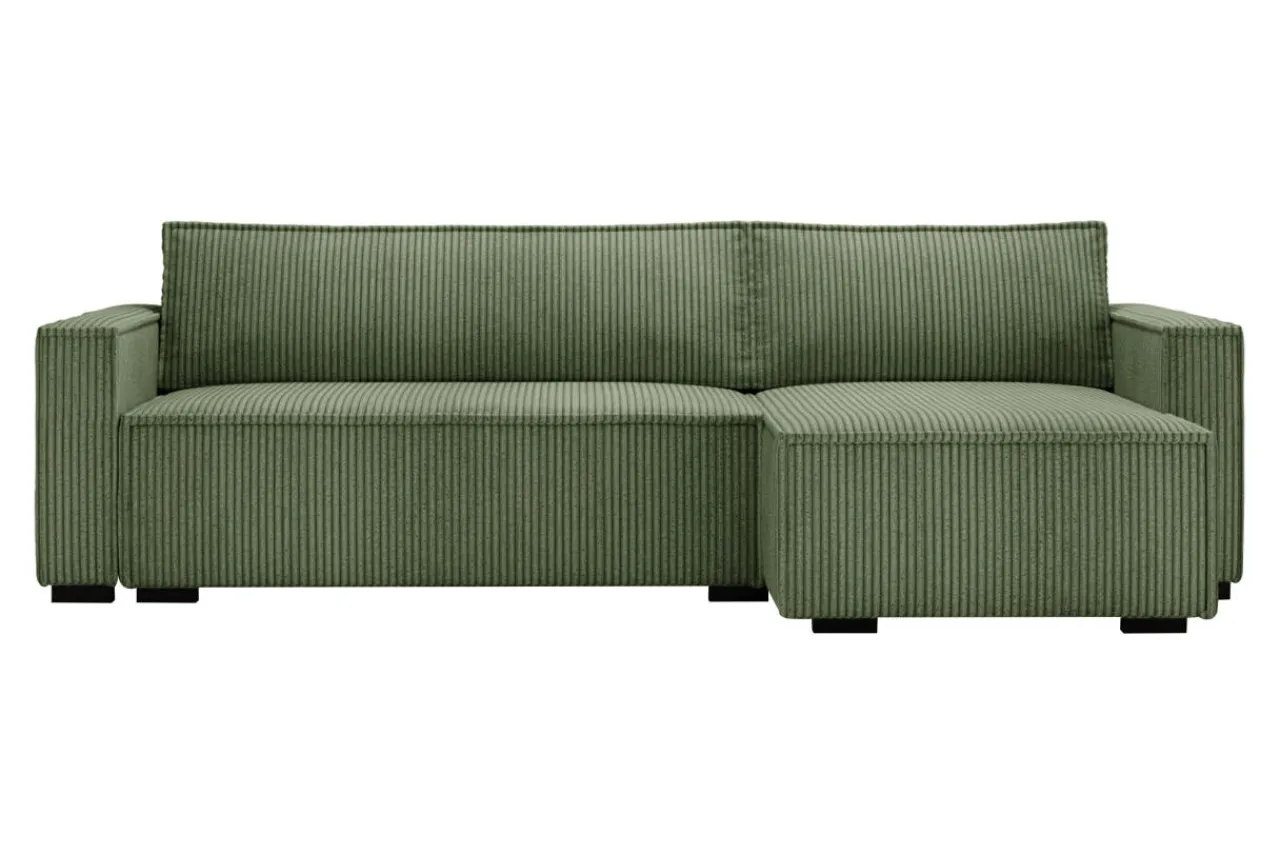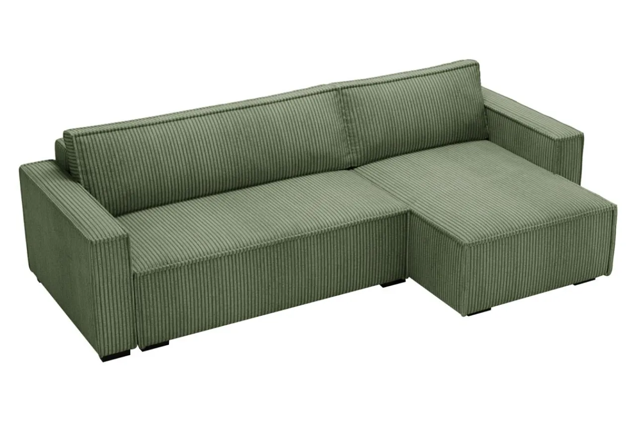 Lubisz zielone akcenty we wnętrzach? Narożnik GROVER pokryty jest przyjemnym w dotyku sztruksem w oliwkowym kolorze, który dopasujesz do białych ścian i mebli z jasnego drewna.