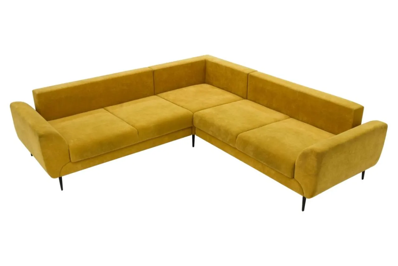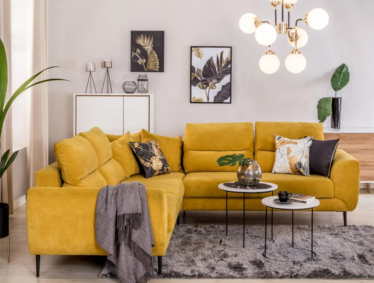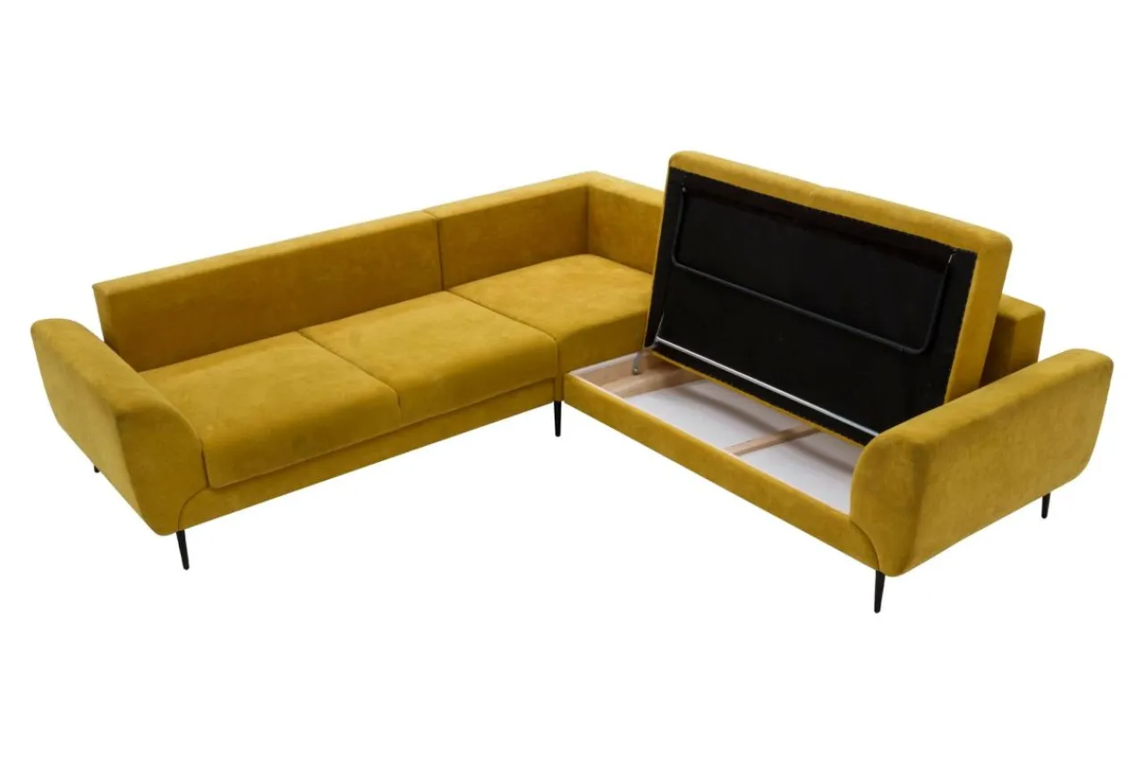 Mebel ustawiono na wysokich nóżkach w ciemnym kolorze, które ułatwiają sprzątanie pod meblem i tworzą kontrast z żywym kolorem tkaniny.