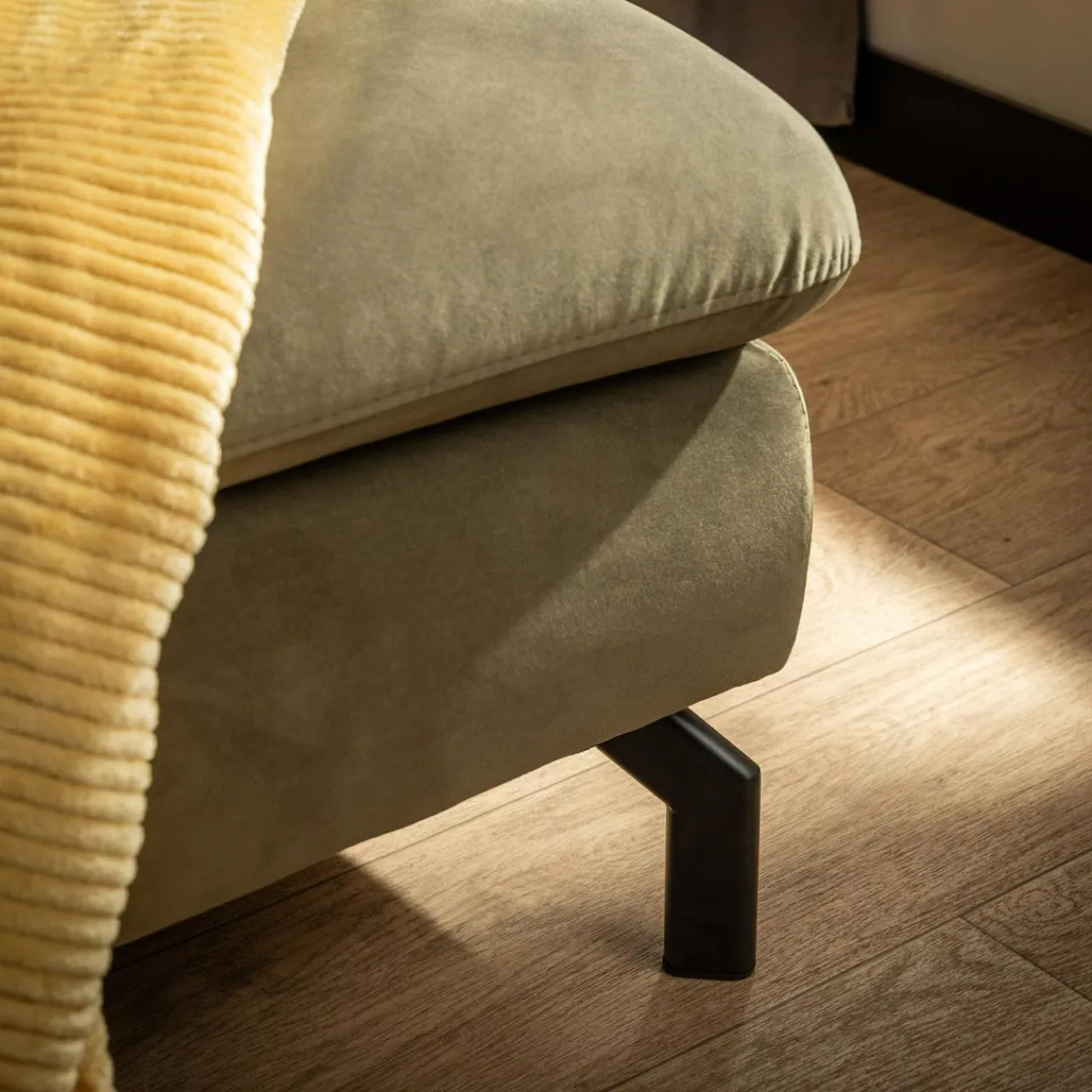 - Welurowa tkanina w oliwkowym kolorze – miękka struktura, która pod wpływem światła zmienia odcień. Oliwkowy kolor, w którym subtelnie zaznaczają się brązowe i zielone tony, wprowadza do pomieszczenia przyjemną, relaksującą atmosferę.