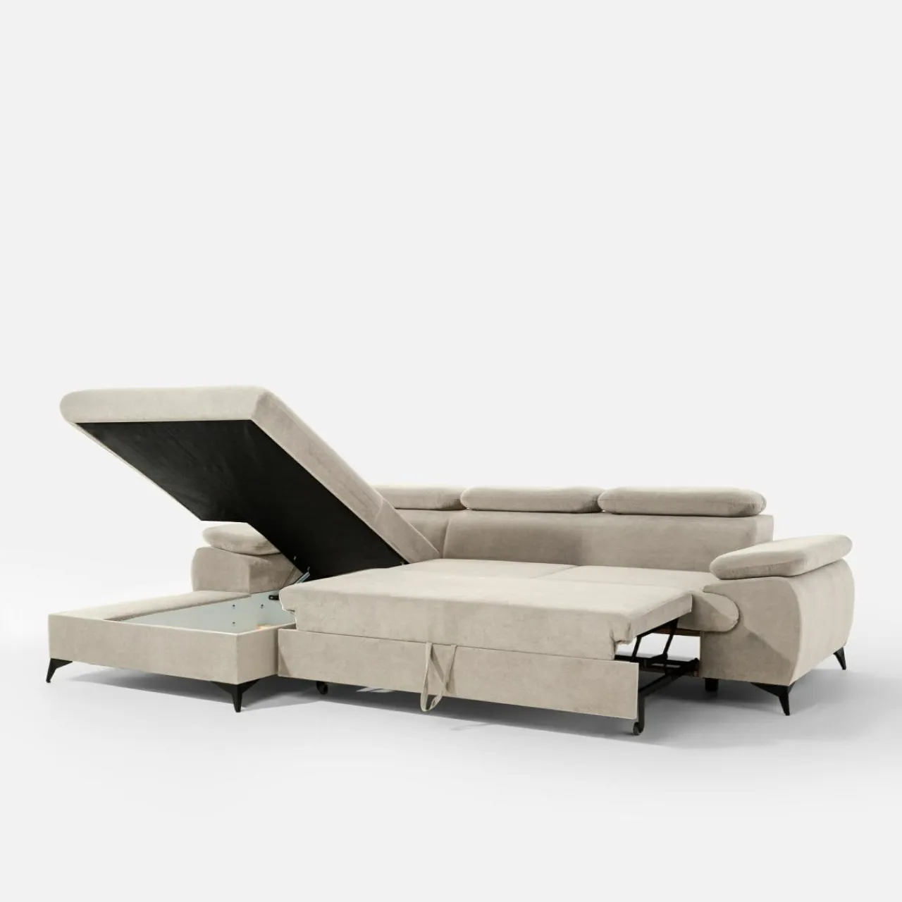 - Dzięki zastosowaniu mechanizmu typu delfin, przekształcenie narożnika w łóżko jest szybkie i wygodne. Co więcej, nie musisz martwić się o odsuwanie mebla od ściany.