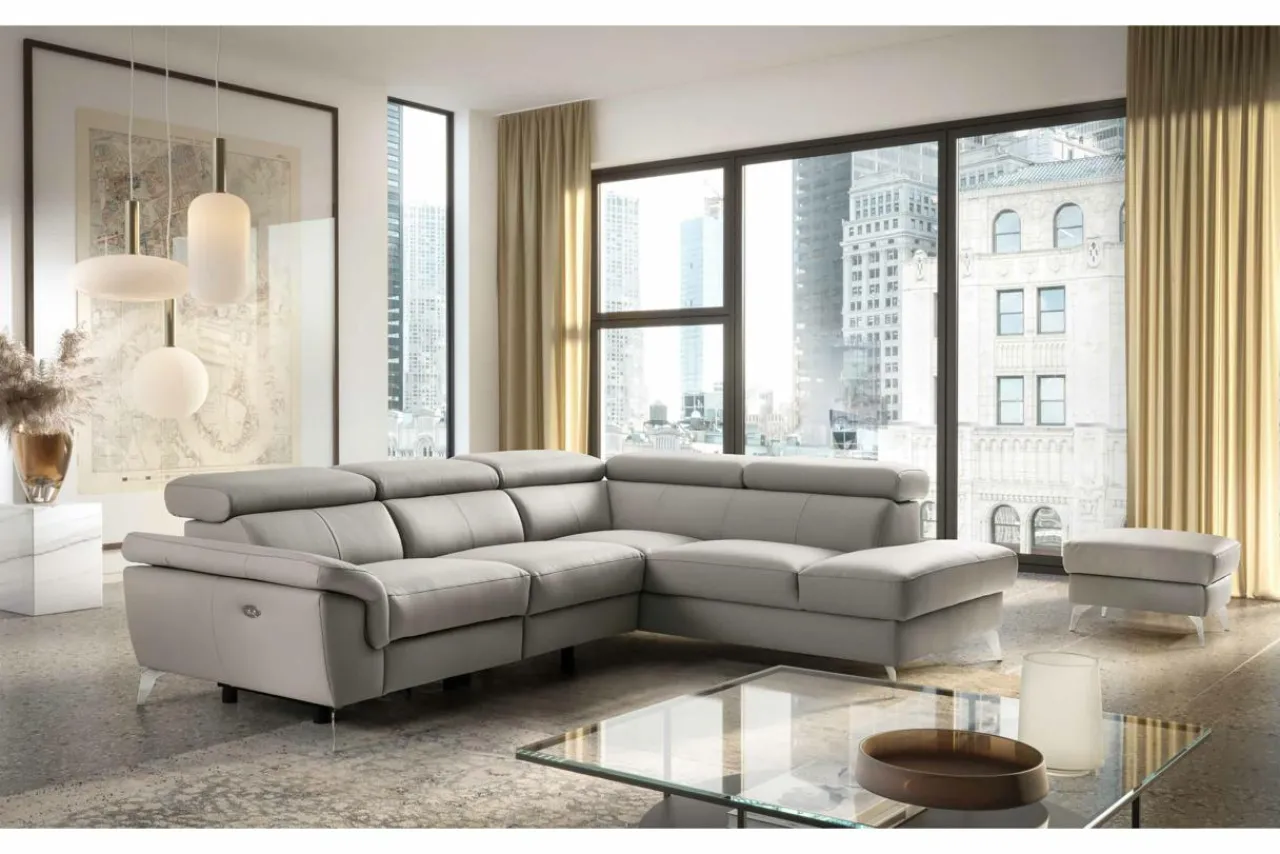 Nowoczesny design narożnika w połączeniu z jasnym kolorem skóry naturalnej stworzą stylowy punkt przestrzeni wypoczynkowej.