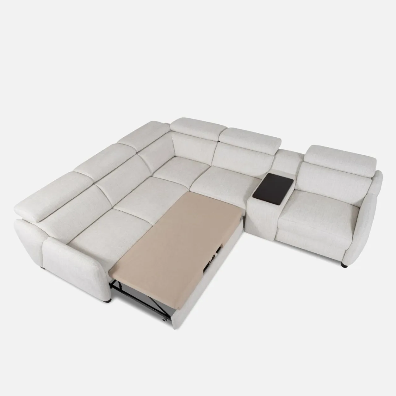 - Narożnik wyposażony jest w fotel z elektryczną funkcją relaks, która pozwala rozsiąść się wygodnie w pozycji półleżącej — idealnej do oglądania filmów, czytania książek lub po prostu relaksu.