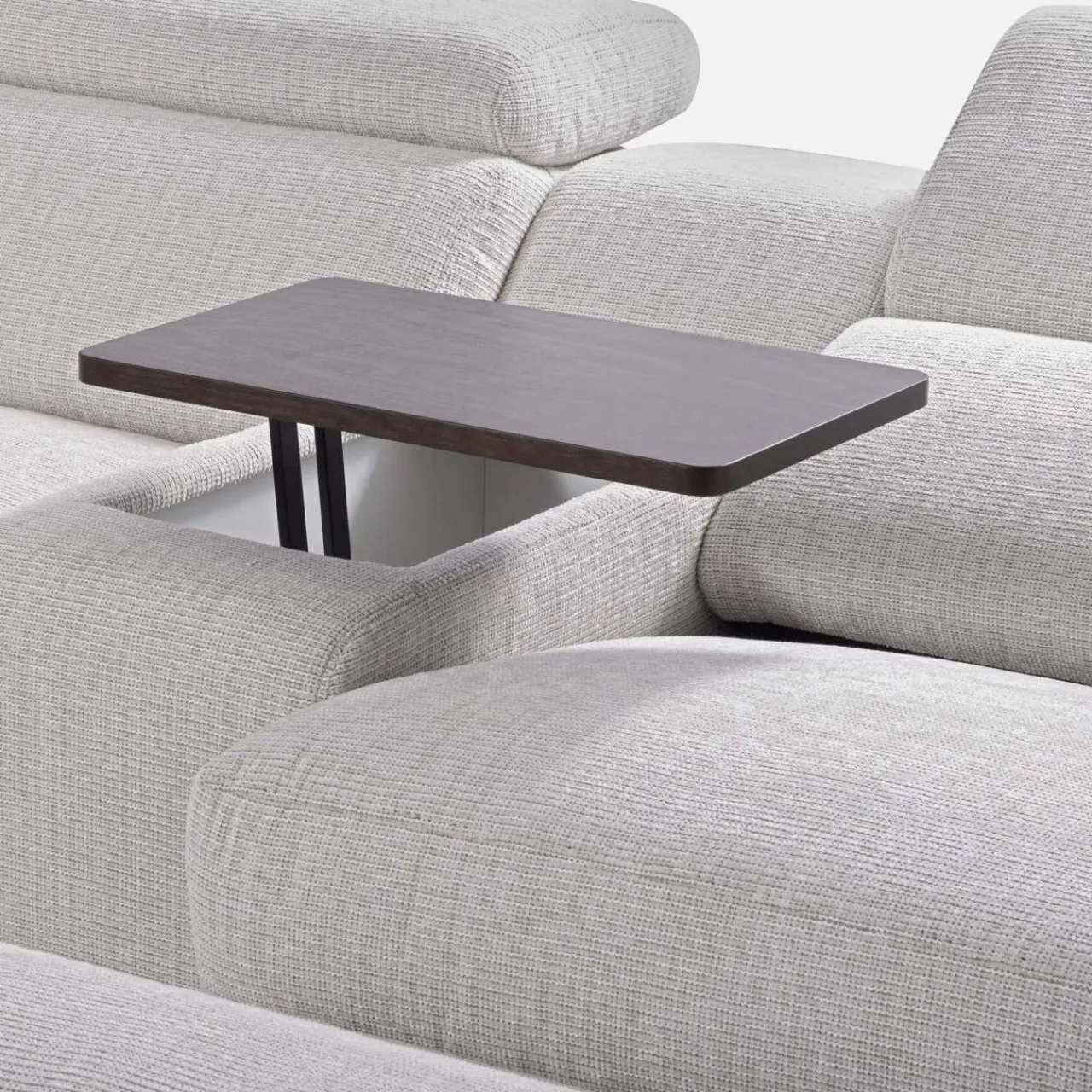 Ciemnobrązowa tkanina otula narożnik LIVORNO, wprowadzając do wnętrza lekkość i przytulność. Dzięki elektrycznej funkcji relaksu i wygodnemu barkowi na przekąski nie będziesz chciał opuszczać tego miejsca!