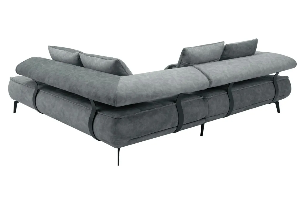 SELEDO L jest utrzymany w chłodnej tonacji, którą podkreśla połączenie szarej tapicerki w metalicznym odcieniu oraz czarnych, matowych nóżek i wsporników przy oparciu.