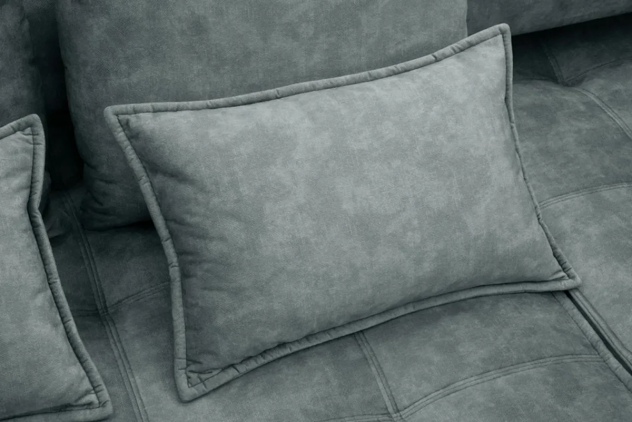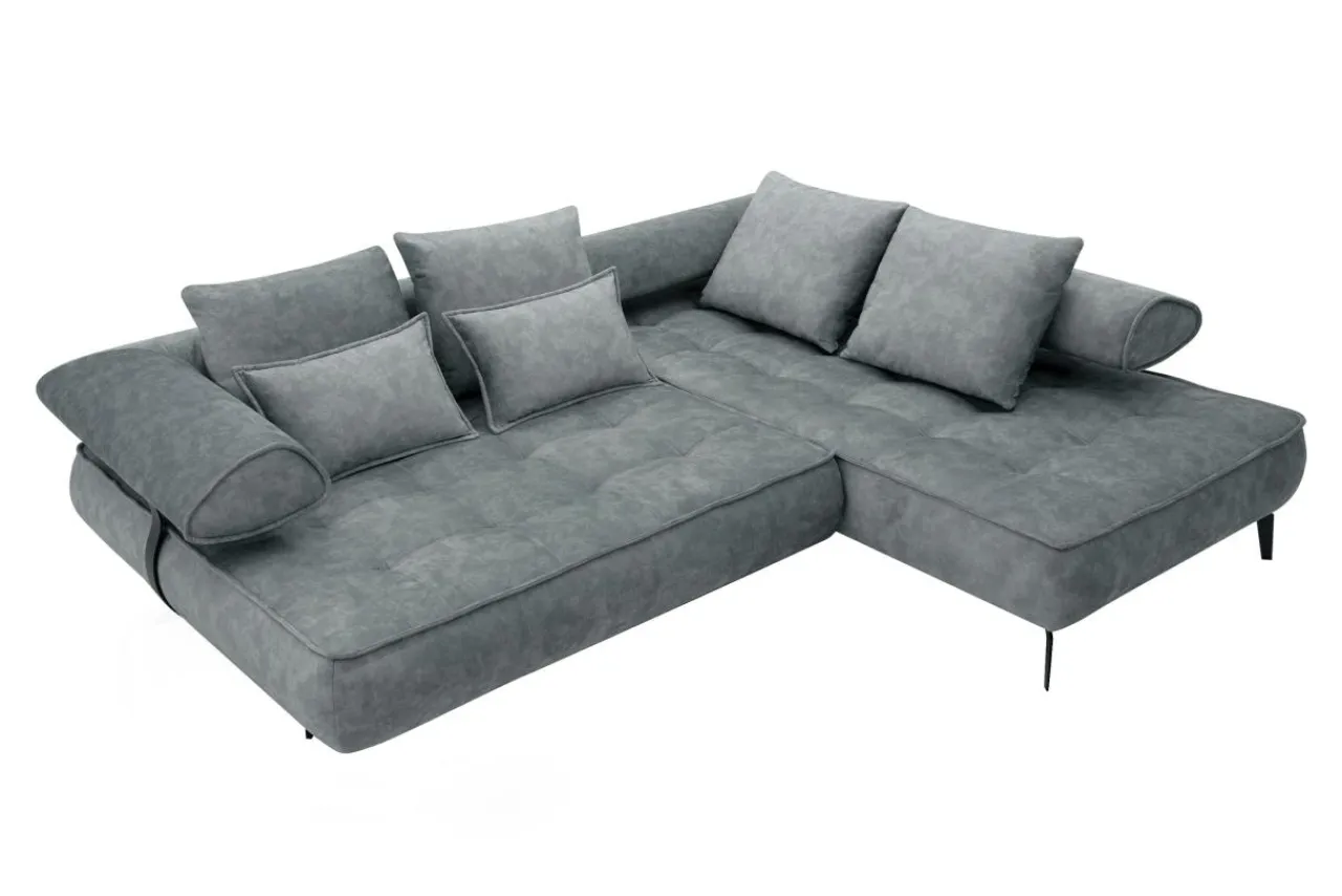 Siedzisko w kształcie litery „L” wzbogacono o ozdobne pikowanie. Podłokietniki są uniesione nieco wyżej i połączone z oparciem dzięki metalowym wspornikom. A do kompletu dostajesz 4 luźne poduszki oparciowe oraz 2 mniejsze o charakterze dekoracyjnym.
