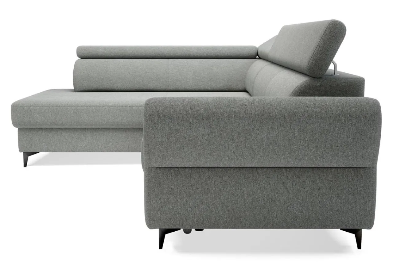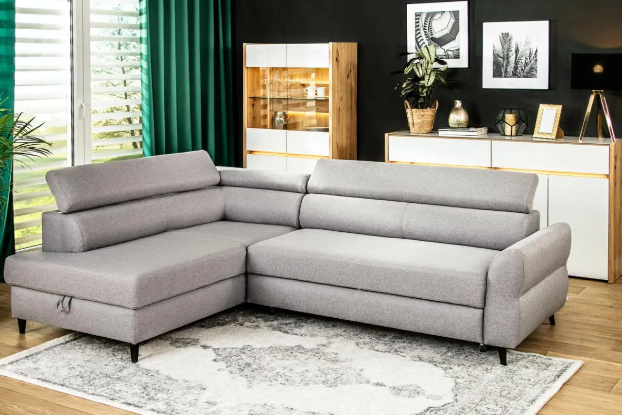 Szara tapicerka sprawia, że narożnik dobrze prezentuje się w każdym pokoju urządzonym w chłodnej kolorystyce.