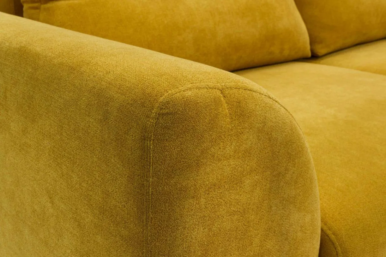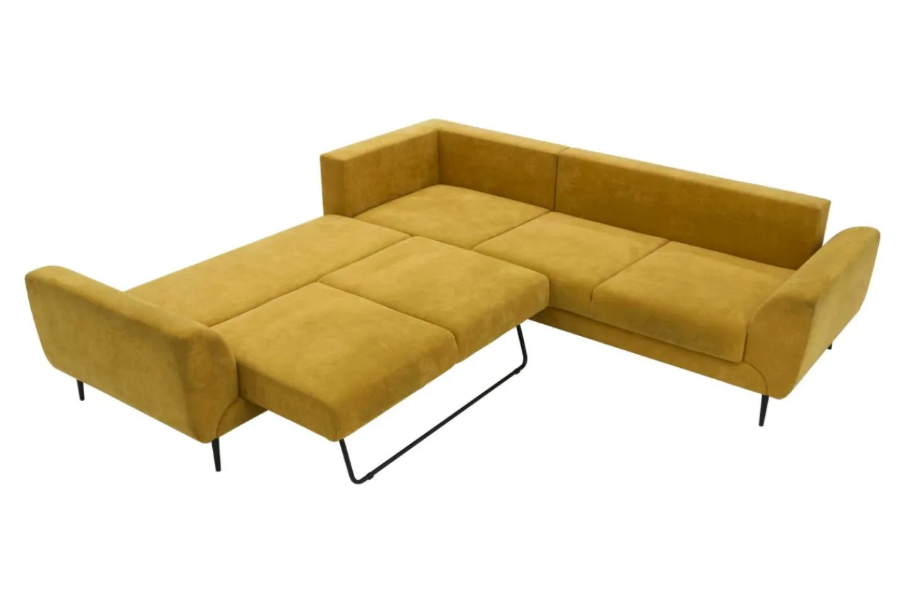 Mebel ustawiono na wysokich nóżkach w ciemnym kolorze, które ułatwiają sprzątanie pod meblem i tworzą kontrast z żywym kolorem tkaniny.
