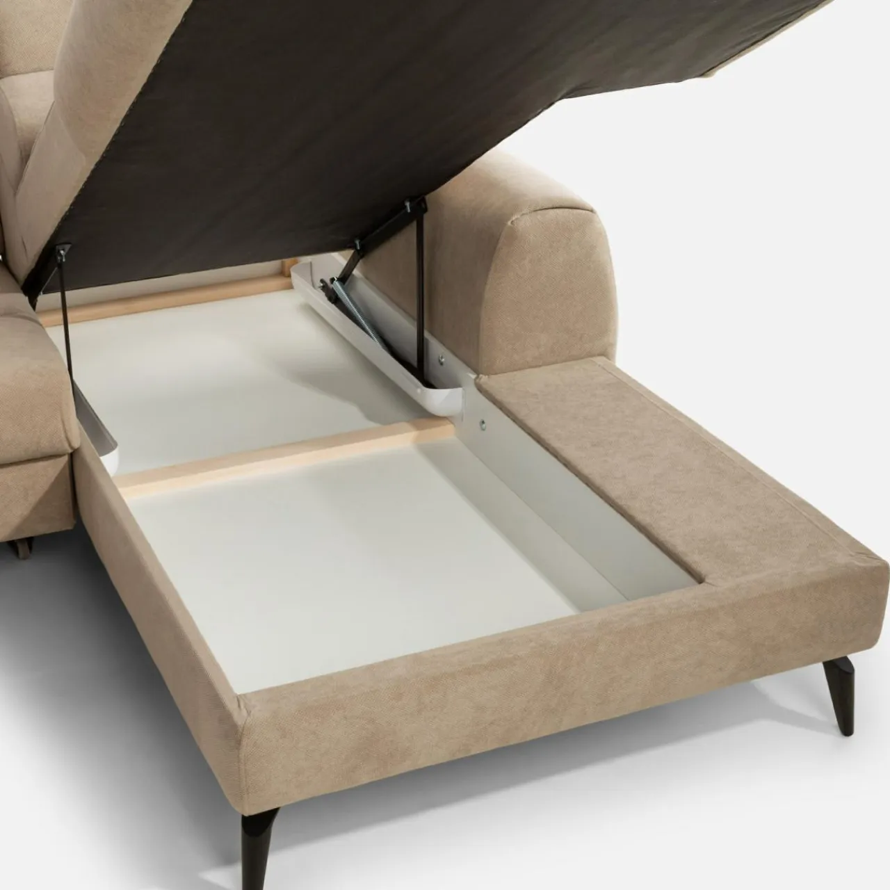 - Pojemnik w leżance to dodatkowa przestrzeń na pościel i inne domowe tekstylia – możesz z niego korzystać, nawet jeśli narożnik będzie rozłożony.