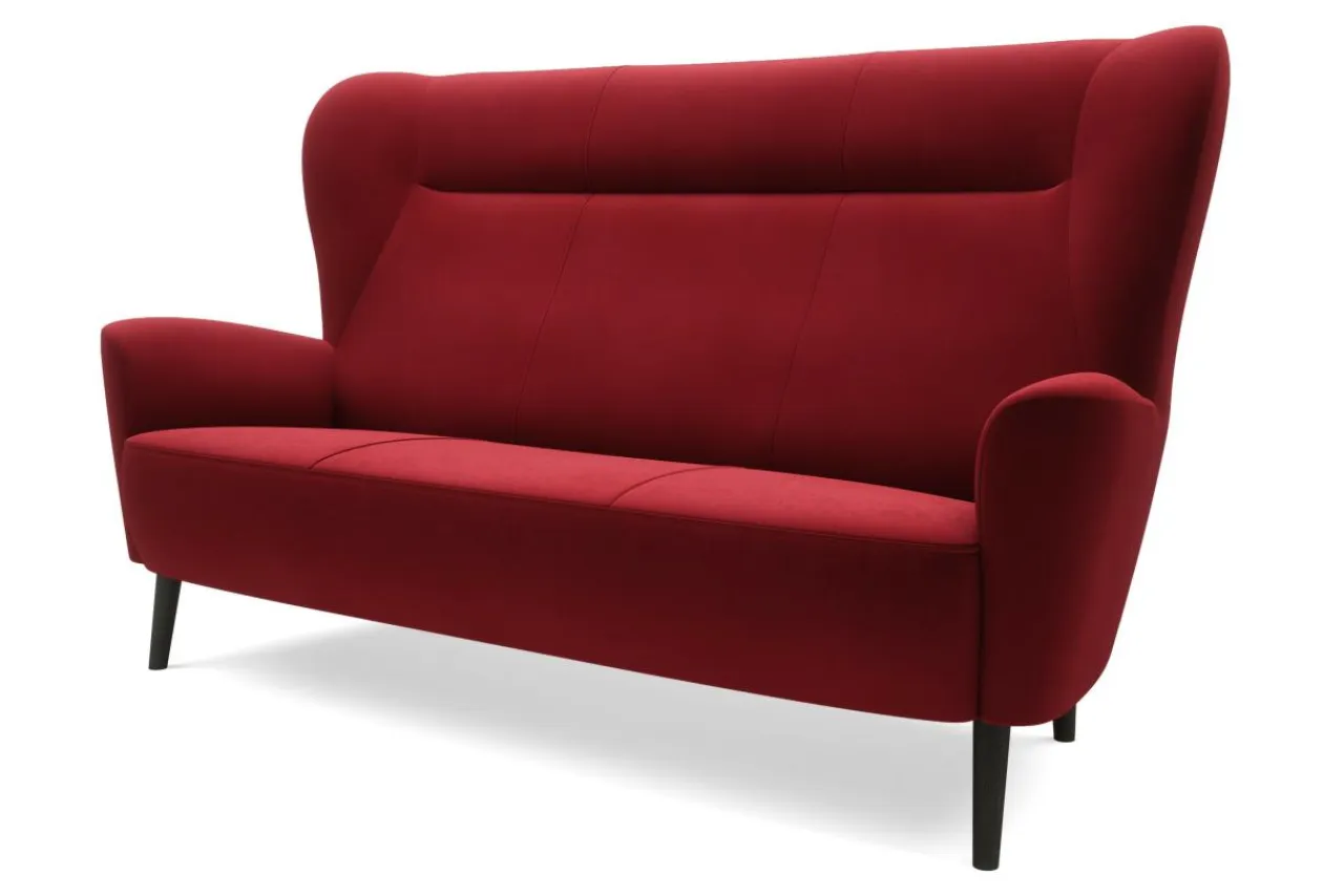 Odważny, ciemnoczerwony kolor, wysokie nóżki i kształt nawiązujący do fotela „uszaka” czynią sofę dekoracyjnym meblem, który będzie główną ozdobą salonu.
