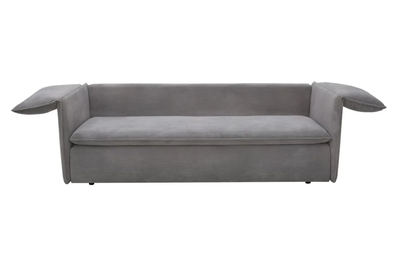 Przyciąga wzrok szarą, sztruksową tapicerką, ale przede wszystkim ruchomymi podłokietnikami w formie poduszek.