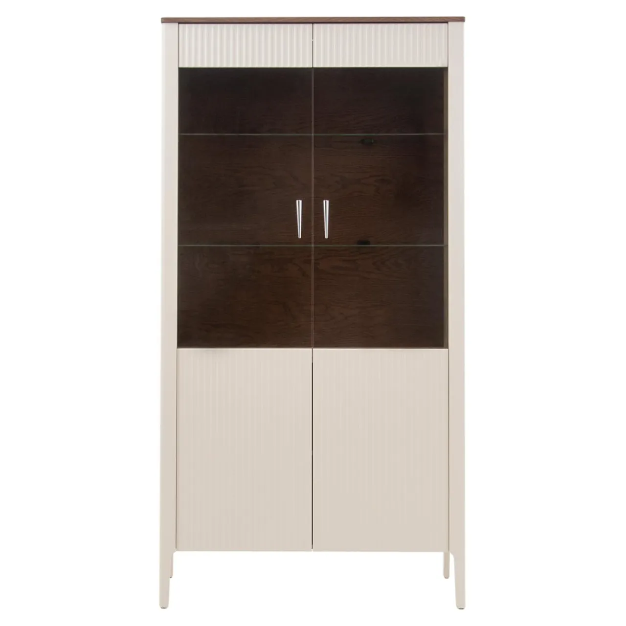 Jasny korpus witryny pięknie współgra z ciemnym blatem oraz brązowymi plecami witryny.