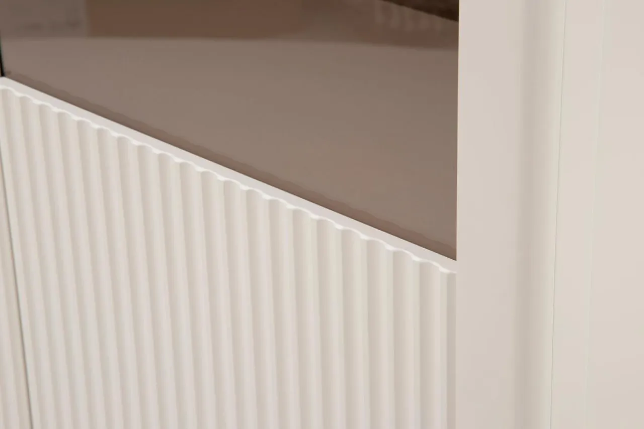- W przeszklonej części frontu zastosowano szkło antisol, natomiast całość wykonana jest w płyty MDF pokrytej matowym lakierem.