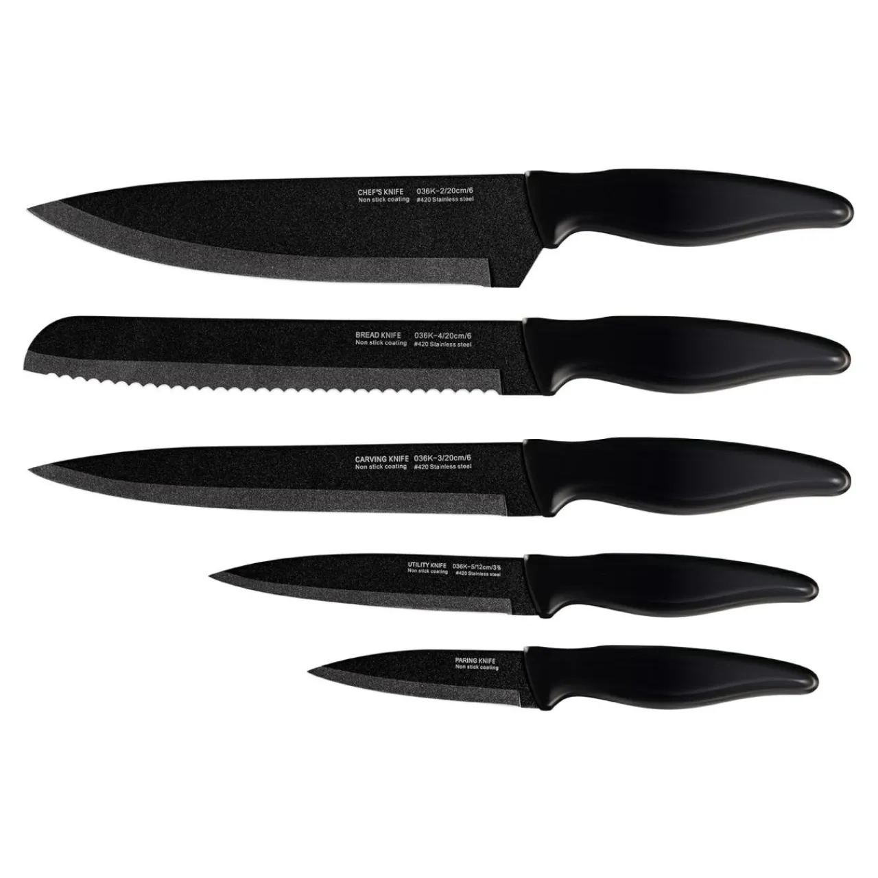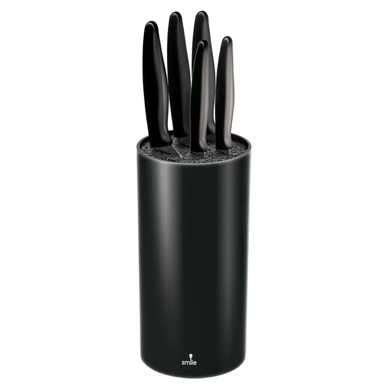 Designerski zestaw 5 stalowych noży w bloku, z wyjmowanym wkładem wykonanym z plastikowych pręcików. Noże posiadają precyzyjnie wyprofilowane ostrza z wysokiej jakości stali nierdzewnej pokrytej powłoką nieprzywierającą oraz uchwyty z antypoślizgową powłoką typu soft touch. Uniwersalny blok przystosowany jest do dowolnych noży, zarówno stalowych jak i ceramicznych.