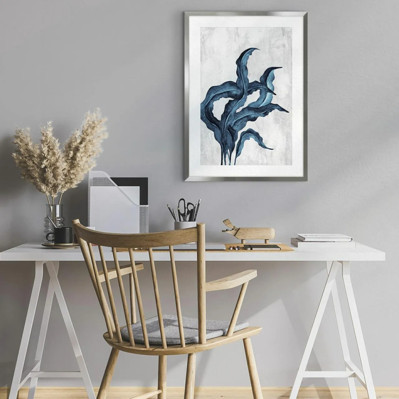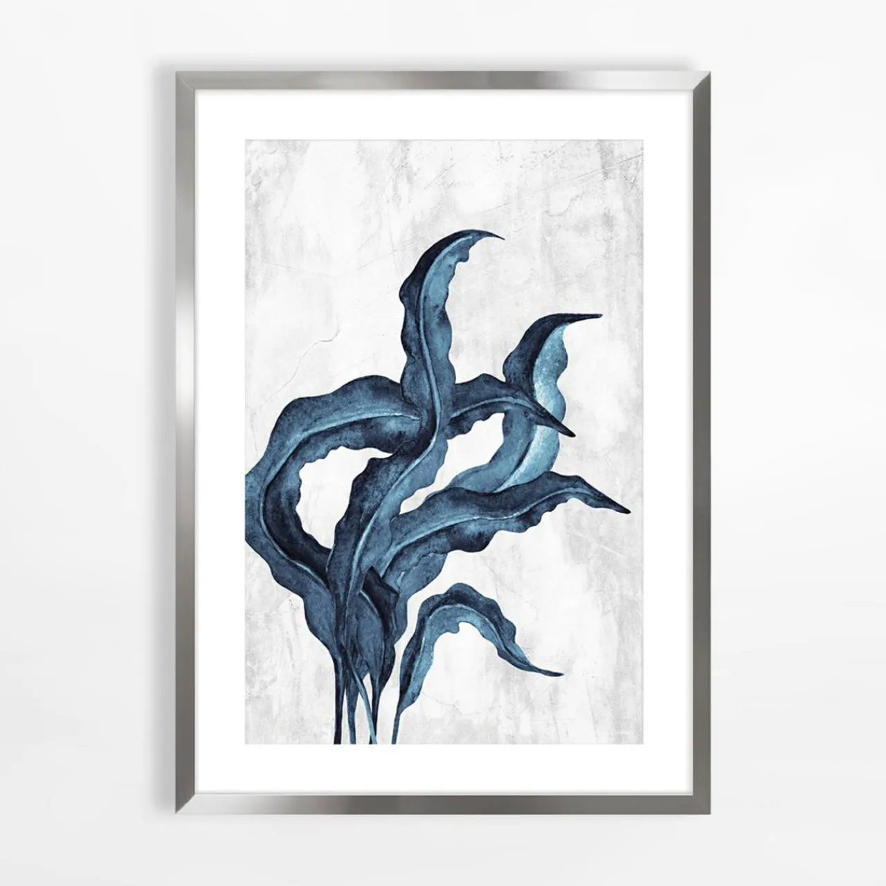 Obraz WATER PLANT II o wymiarach 50×70 cm można zawiesić na dopasowanej ramie w odcieniu niklu.