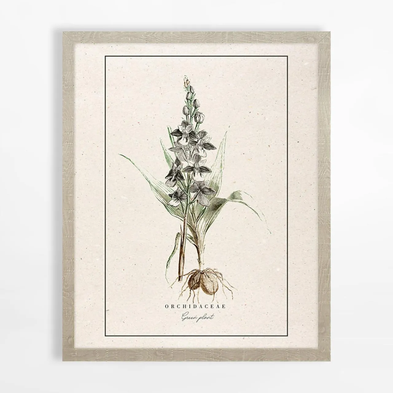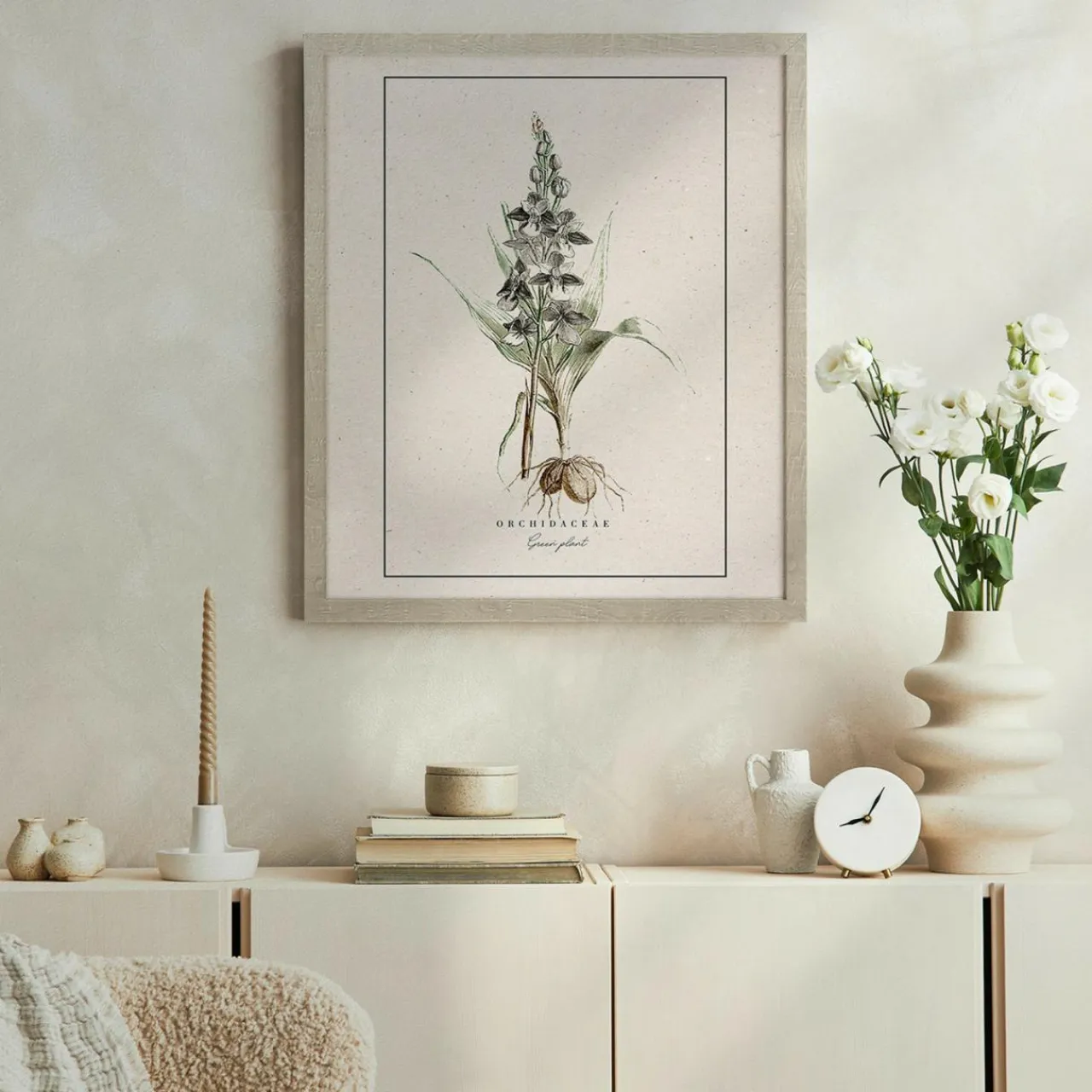 Obraz do sypialni BOTANIC o wymiarach 40×50 cm zawiesisz w drewnopodobnej ramie. Dołączono również zawieszkę.