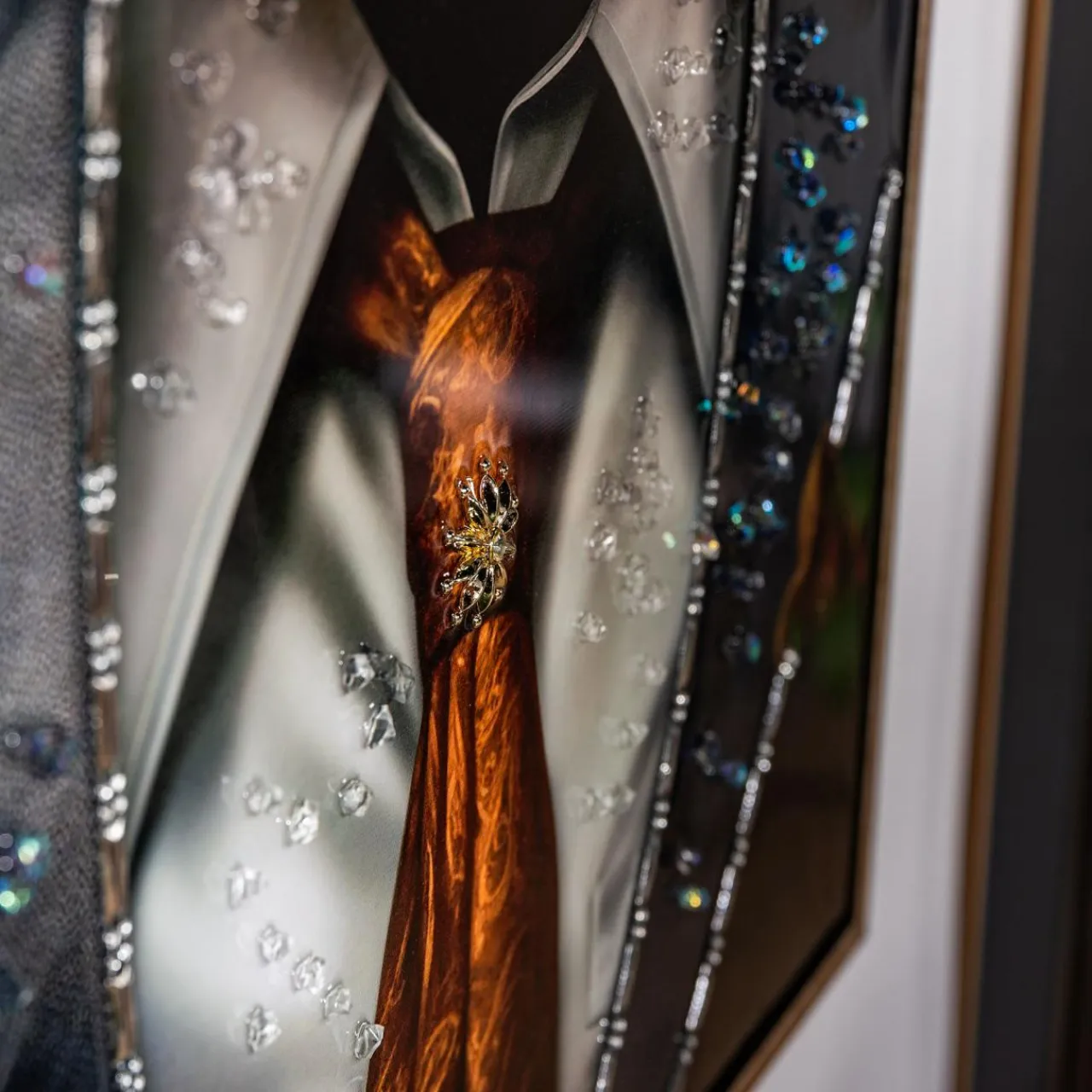 Obraz na płótnie z oryginalną grafiką małpy w eleganckim garniturze to niebanalny akcent – zdobiony akrylowymi elementami, delikatnie połyskuje, przyciągając wzrok.