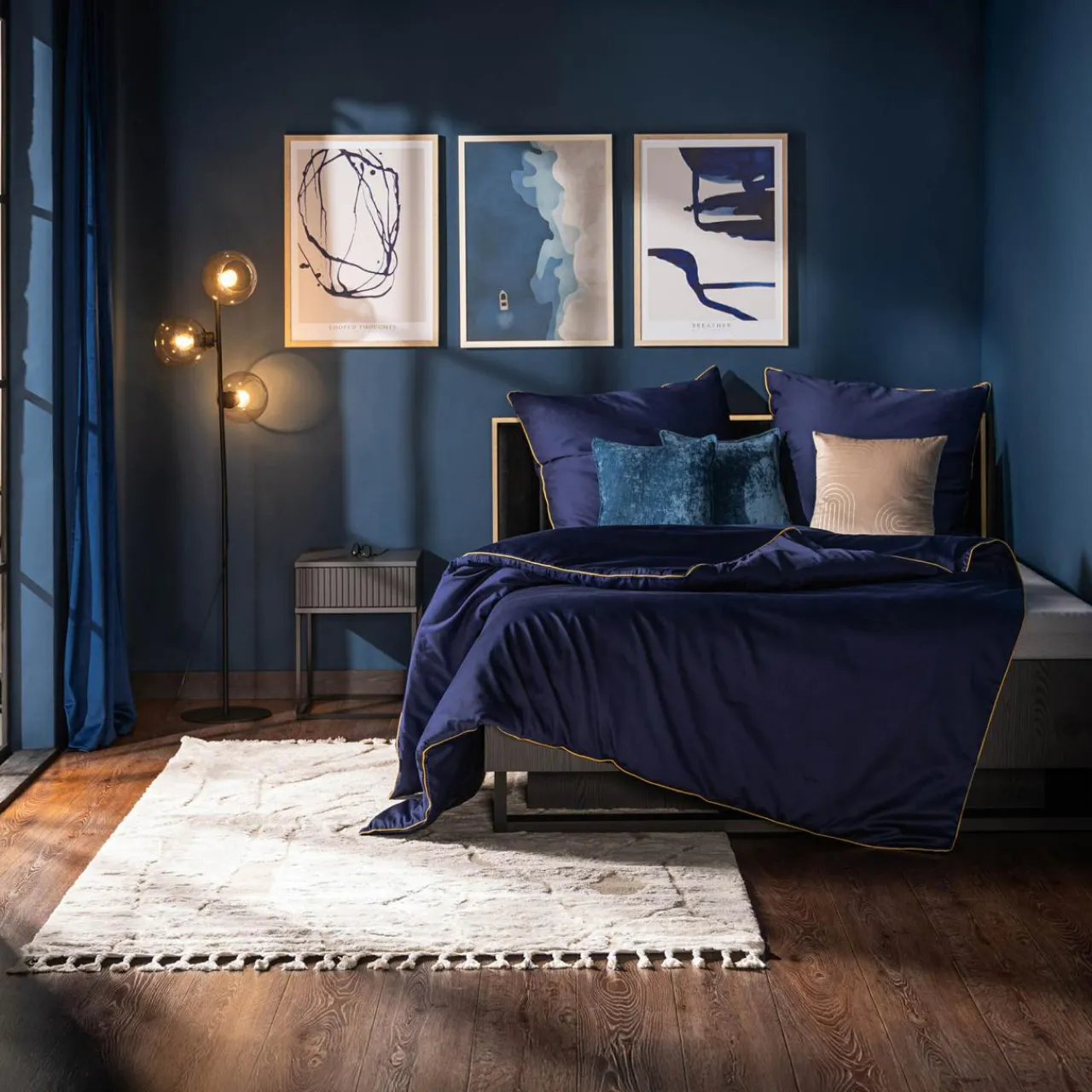 Obraz LINE COBALT uatrakcyjni aranżację salonu oraz sypialni.