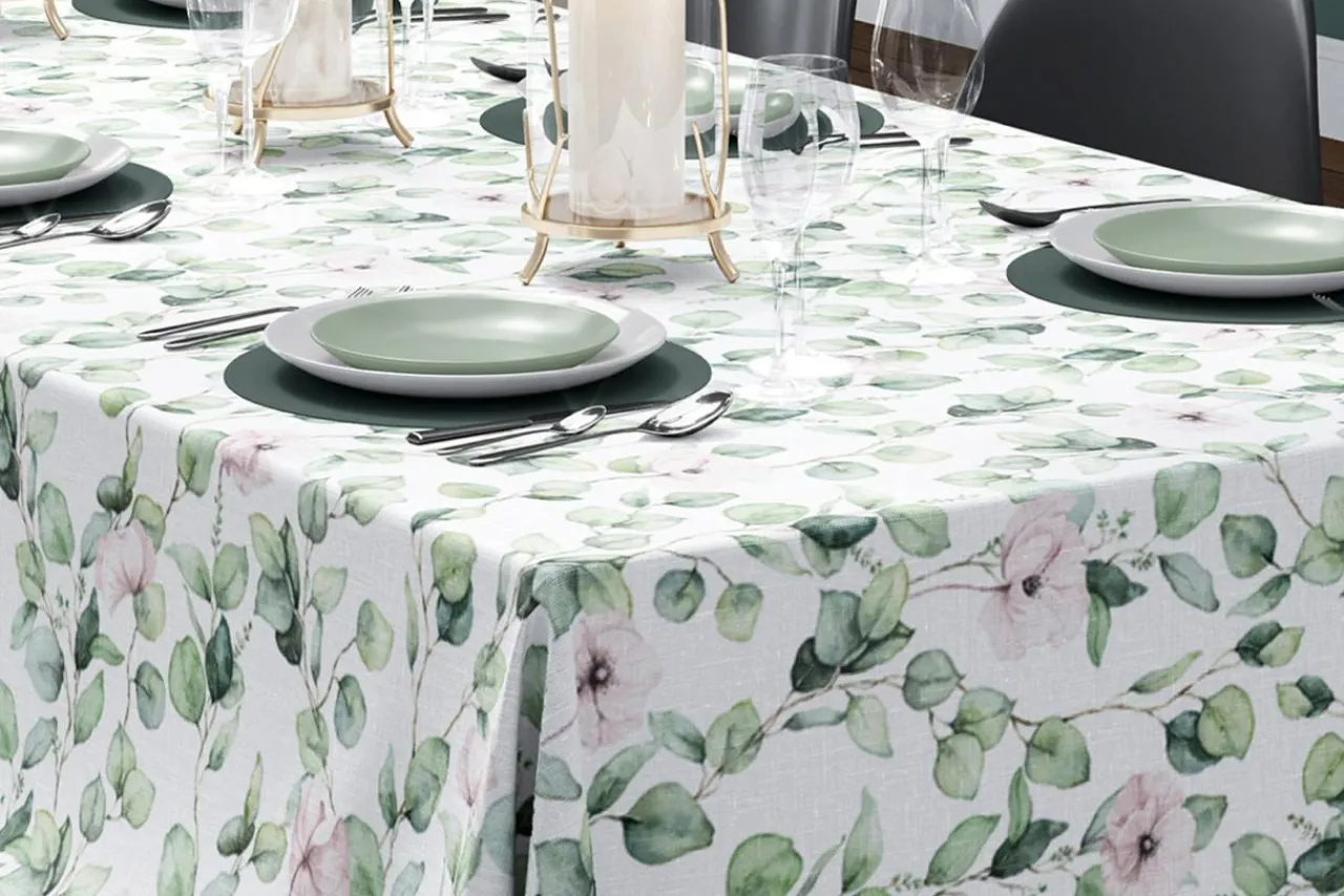 Wybierz obrus który jest wykonany jest z tkaniny z poliestru oraz bawełny. Obrus zdobi wzór szarych kwiatów.
