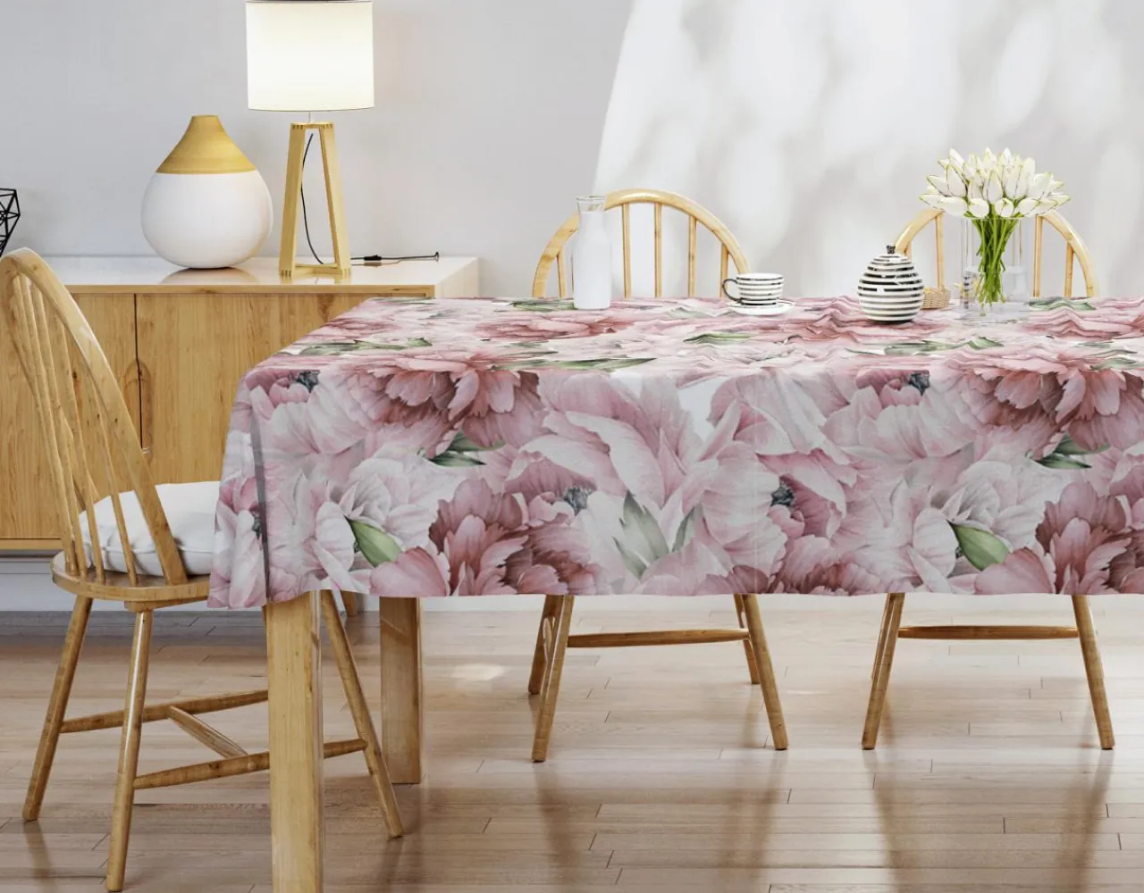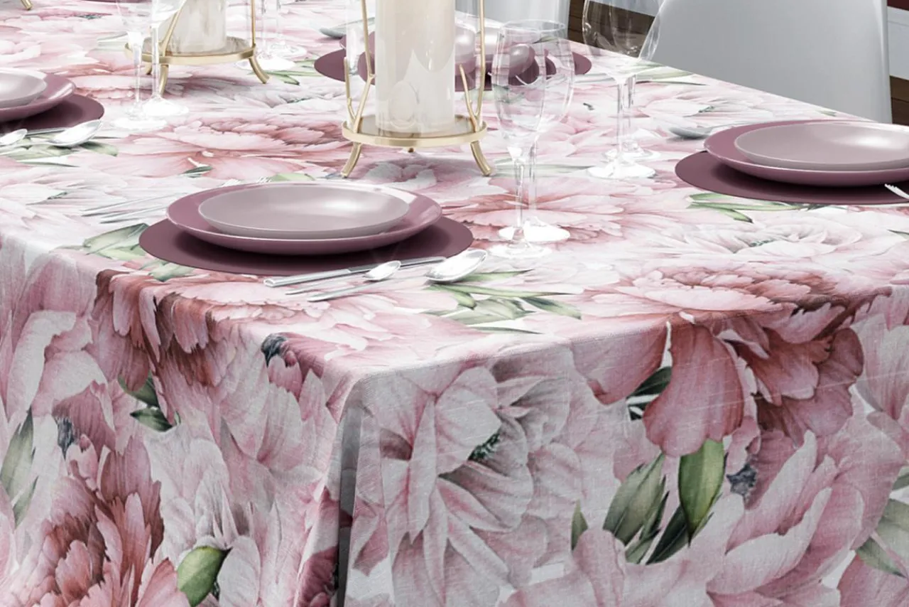 Wybierz obrus który jest wykonany jest z tkaniny z poliestru oraz bawełny. Obrus zdobi wzór różowych kwiatów.