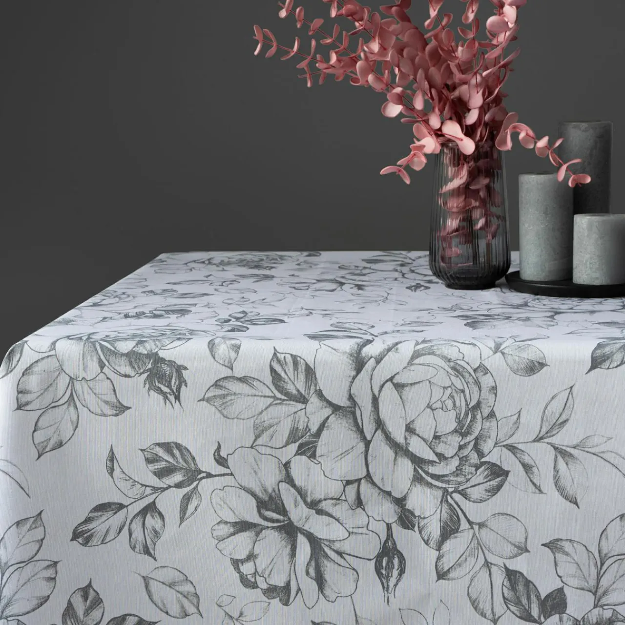 Lubisz roślinne akcenty? Obrus w szare kwiaty subtelnie udekoruje niedzielny stół w jadalni. Twoja porcelanowa zastawa będzie na nim pięknie wyglądać.