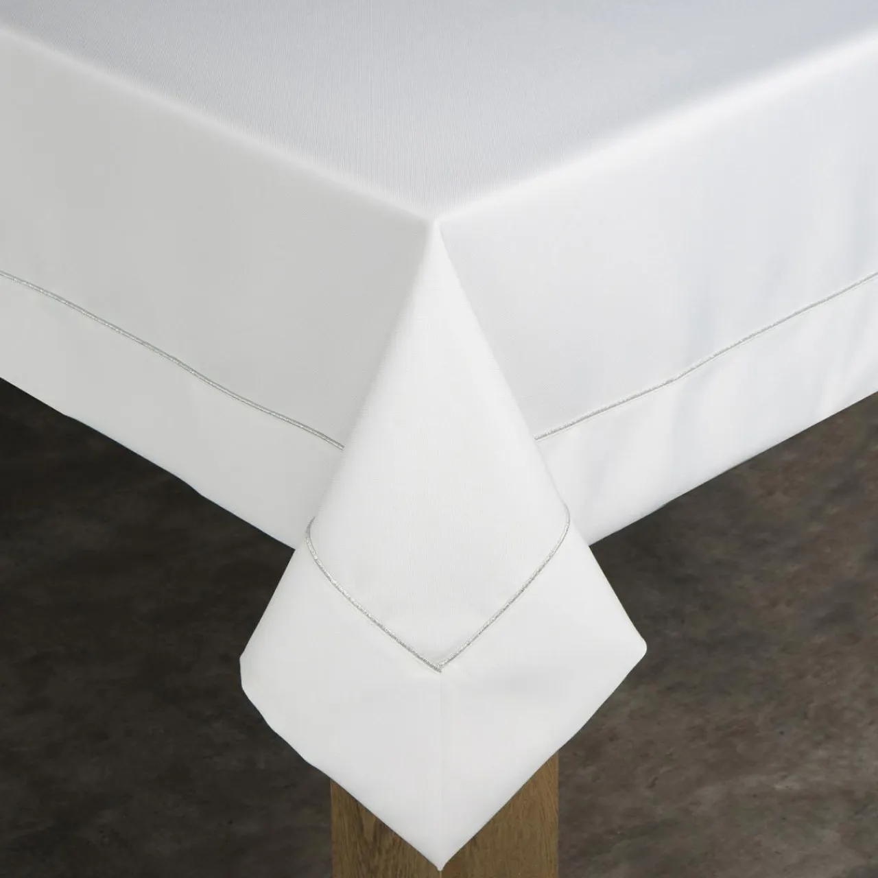 Szeroka listwa dodaje elegancji a srebrna lamówka na brzegach tkaniny sprawia, że obrus Karin zyskuje subtelny połysk.