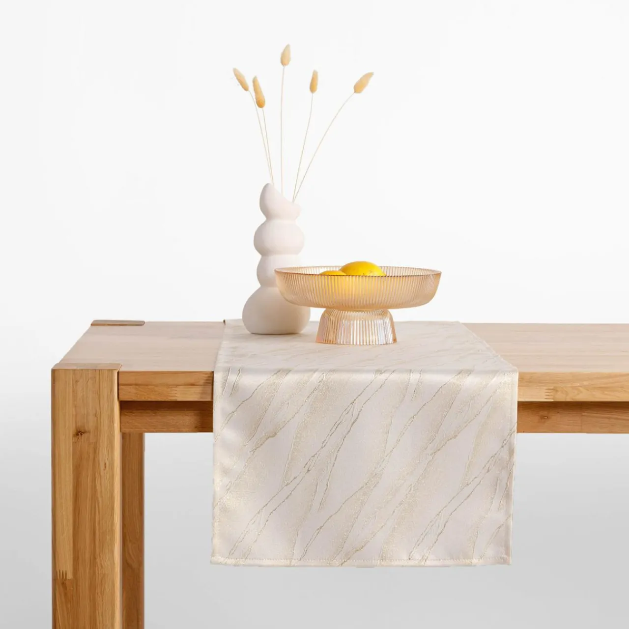 Obrus kremowy w złoty marmur LYMIO to elegancki i nowoczesny element dekoracyjny, który wprowadzi elegancję do Twojego wnętrza. Jego delikatny, kremowy kolor w połączeniu z efektownym wzorem złotego marmuru nadaje mu wyjątkowego charakteru.