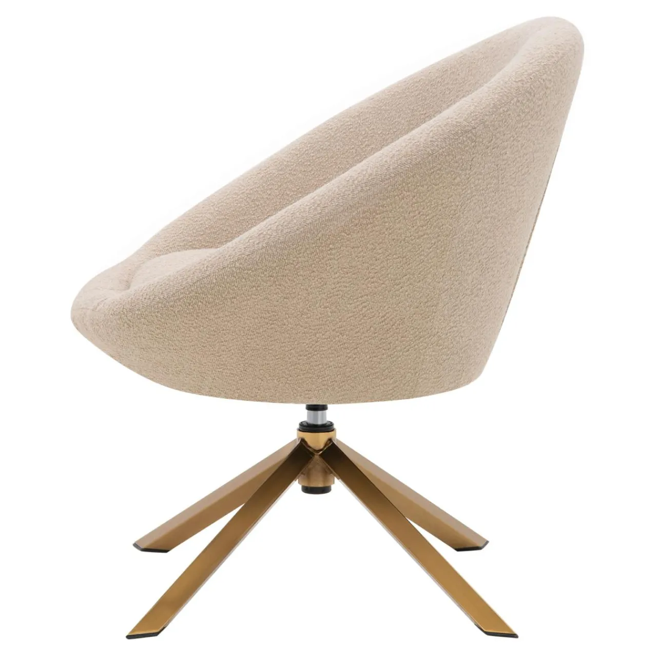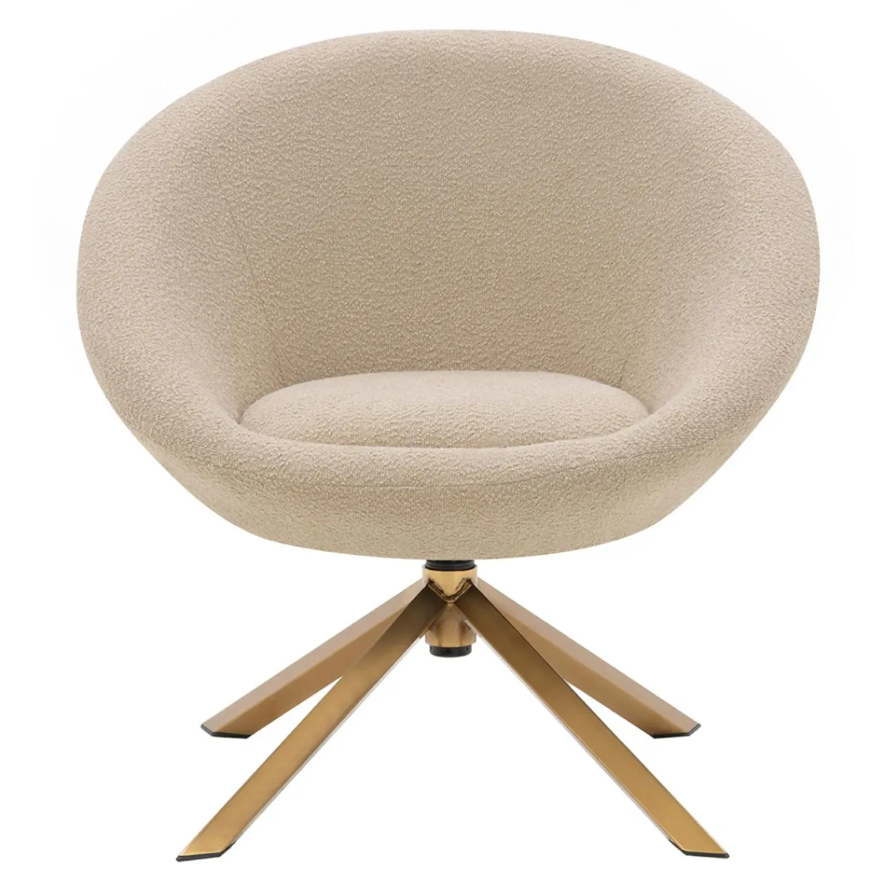 - Fotel pokryto tkaniną o wyrazistej strukturze – przypominającą nieco boucle. Wygląda intrygująco w połączeniu ze złotą podstawą.
