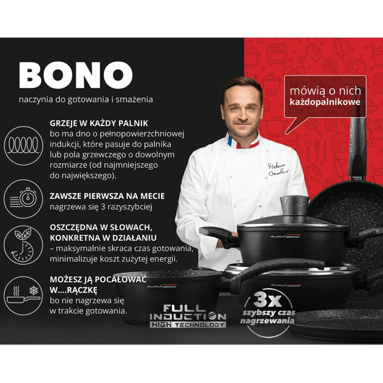 Patelni możesz użyć na każdym rodzaju kuchenki, także indukcyjnej. Co wyróżnia ją spośród innych to pełnopowierzchniowe dno indukcyjne. Umożliwia ono korzystanie z patelni na dowolnej wielkości palniku kuchenki indukcyjnej! Dodatkowo nagrzewa się szybciej niż patelnie z punktowym dnem indukcyjnym.