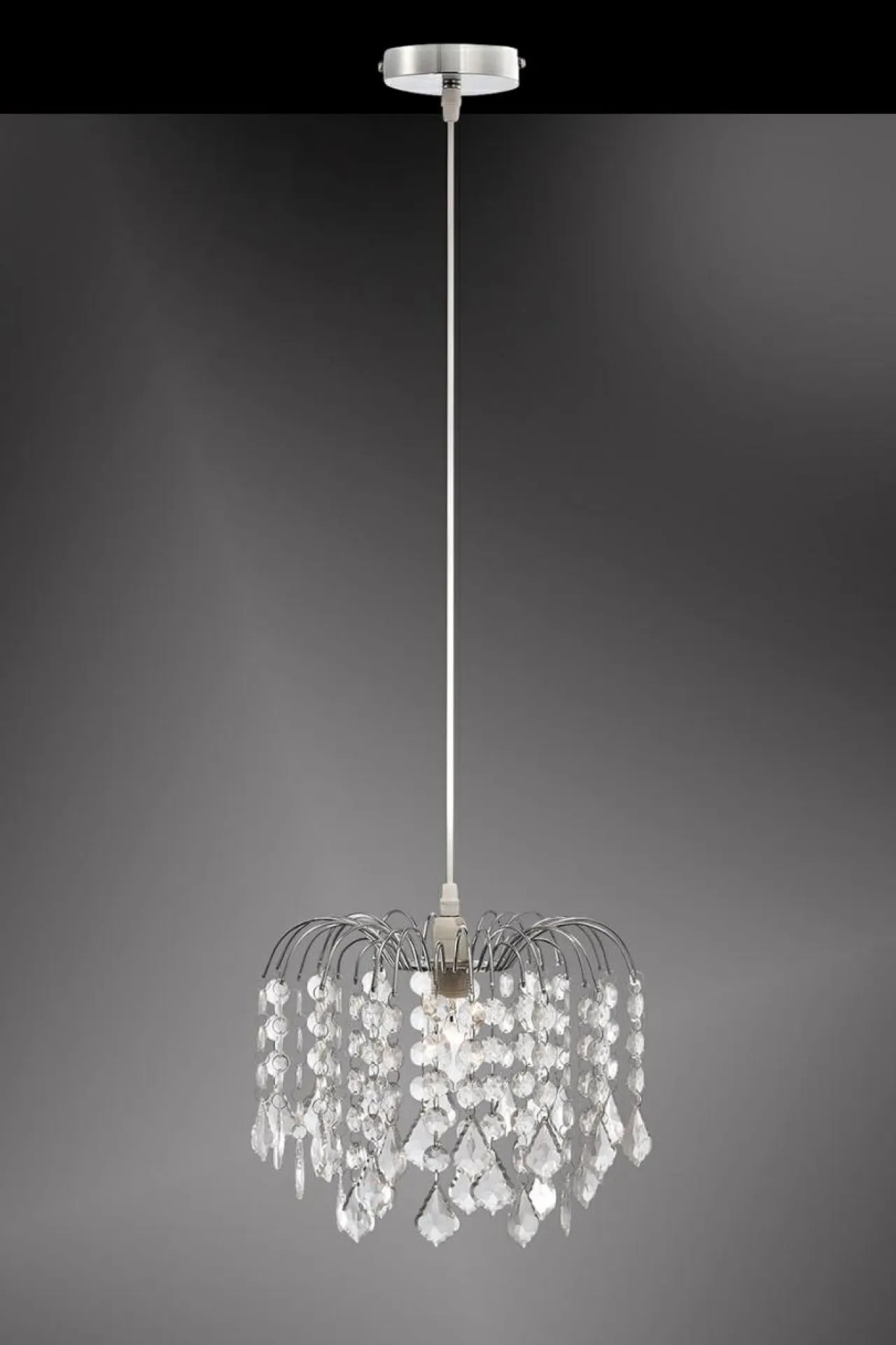 Lampa posiada maksymalną długość 120 cm, co sprawia, że można ją zamontować w pomieszczeniach z wysokim sufitem. Metalowe elementy ozdobne wzbogacone dekoracyjnymi kryształkami tworzą okrąg o średnicy 26 cm. Całość doskonale prezentuje się zarówno przy zapalonym, jak i zgaszonym świetle.