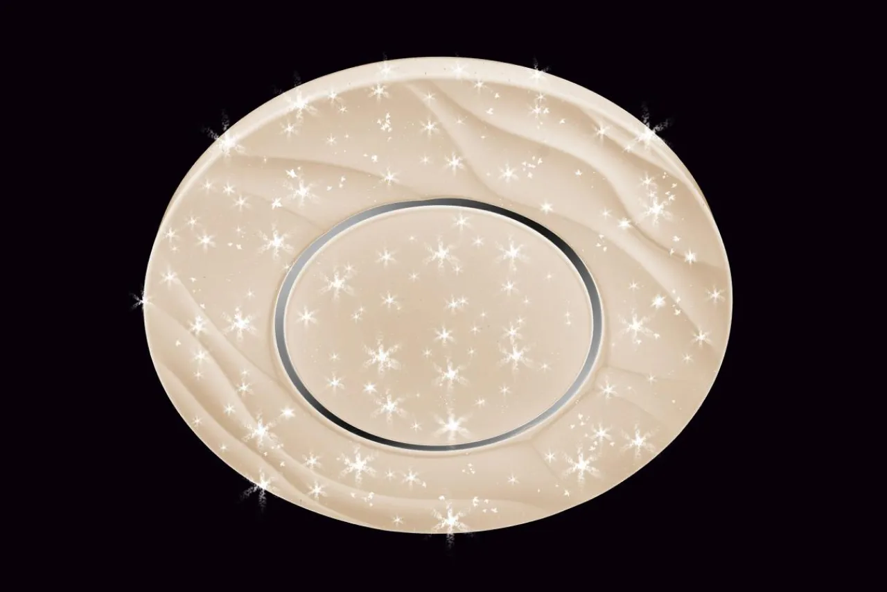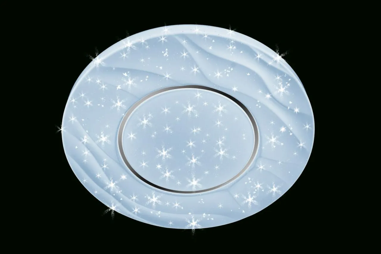 Wzorzysty biały klosz z tworzywa sztucznego wzbogacony o dekorację w postaci lekkich fal na powierzchni oraz efekt rozgwieżdżonego utrzymany jest w nowoczesnym stylu. Jego efektowne wykończenie bardzo interesująco prezentuje się zarówno przy zapalonym, jak i zgaszonym świetle.