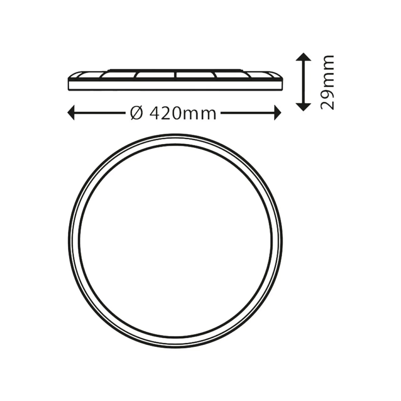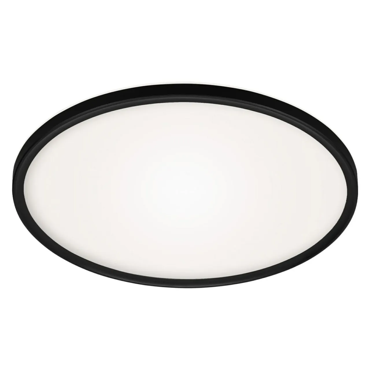 Okrągła podstawa lampy z czarnym obramowaniem jest cienka (ma jedynie 2,9 cm) i lekka, co pozwala zamontować lampę na podwieszanych sufitach.