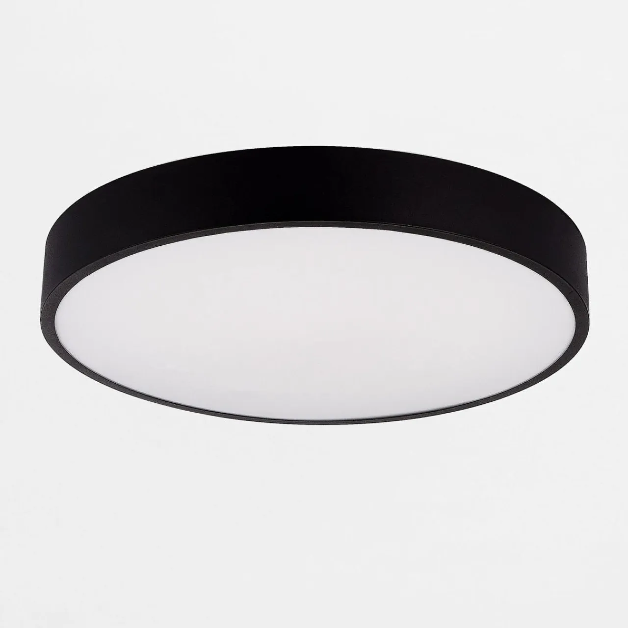 - Wyróżniająca się, czarna obudowa lampy z wkomponowanym modułem LED spełnia rolę na równi oświetlenia, jak i ozdoby sufitu. Wypełnienie plafonu jest mlecznobiałe.