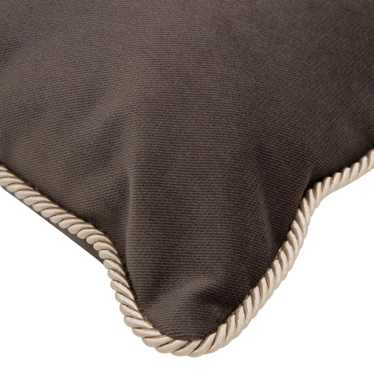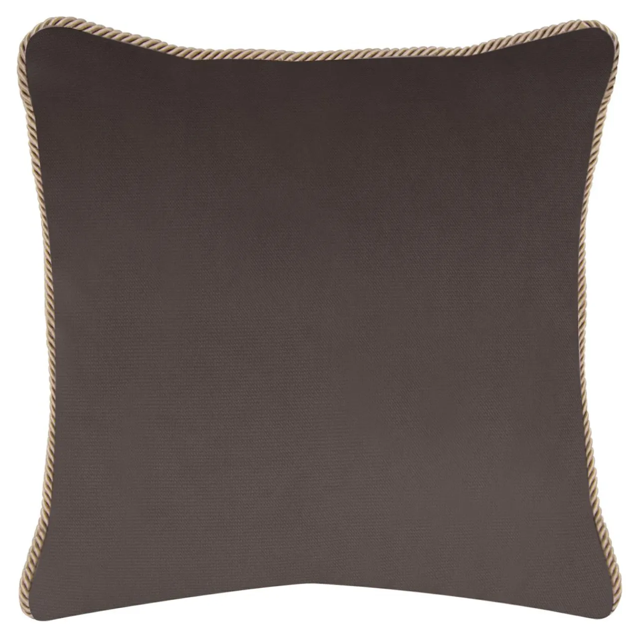 Poduszka w brązowym, czekoladowym kolorze i złotą dekoracyjną lamówką pięknie zaprezentuje się na beżowej sofie lub narożniku.