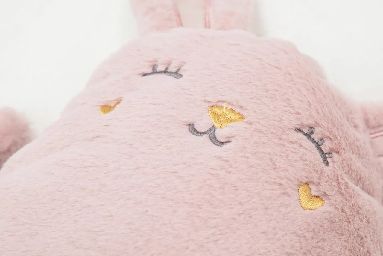 - Poduszka w kształcie śpiącego królika pozostanie przy dziecku na dłużej – trwały poliestrowy materiał ma większą odporność na ścieranie.