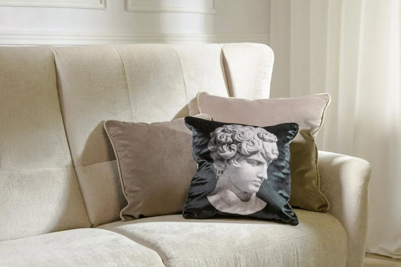 - Boska poduszka na przedniej stronie ma nadruk z głową greckiej rzeźby, tył natomiast ma kolor grafitowy i jest gładki.