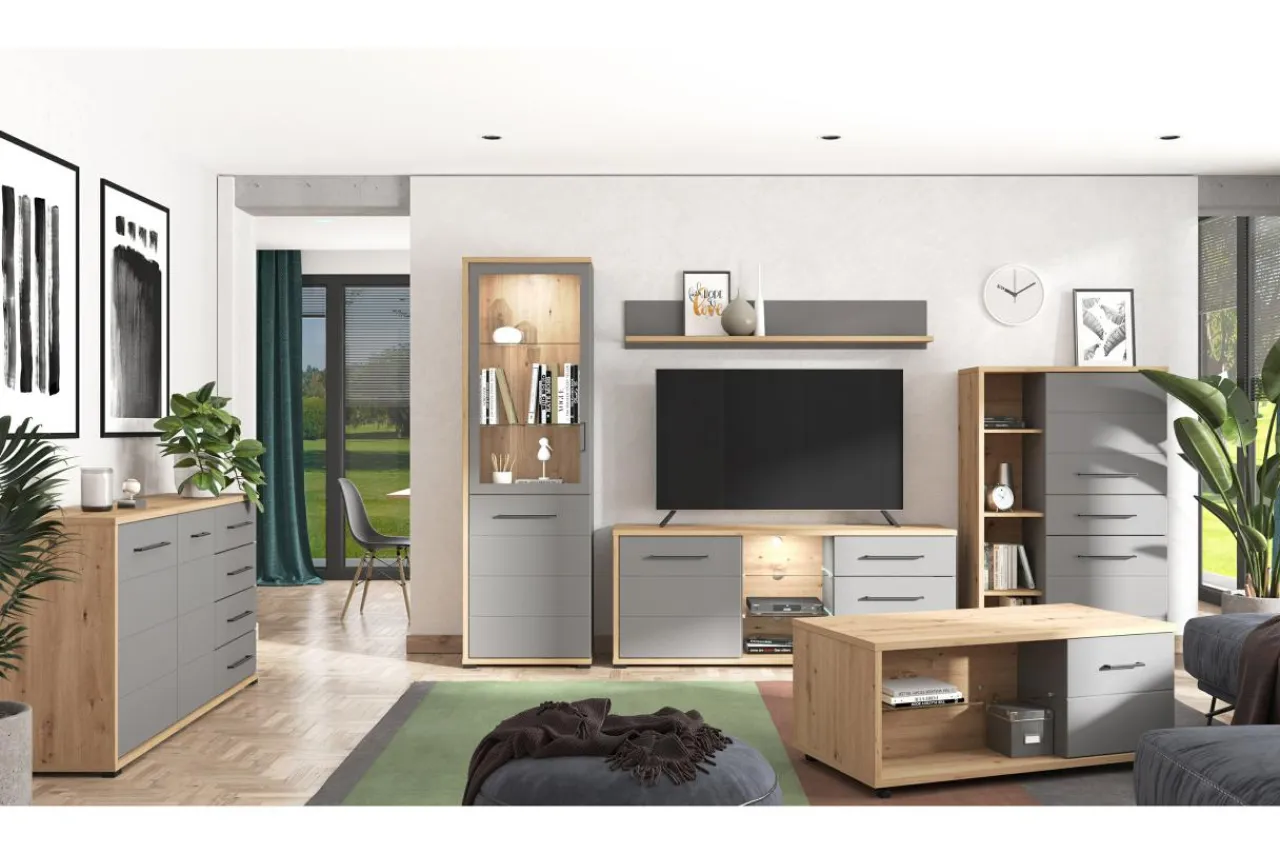 Połączenie szarego matu z kolorem dębu artisan sprawia, że półka świetnie wpasuje się we wnętrza o nowoczesnym charakterze.