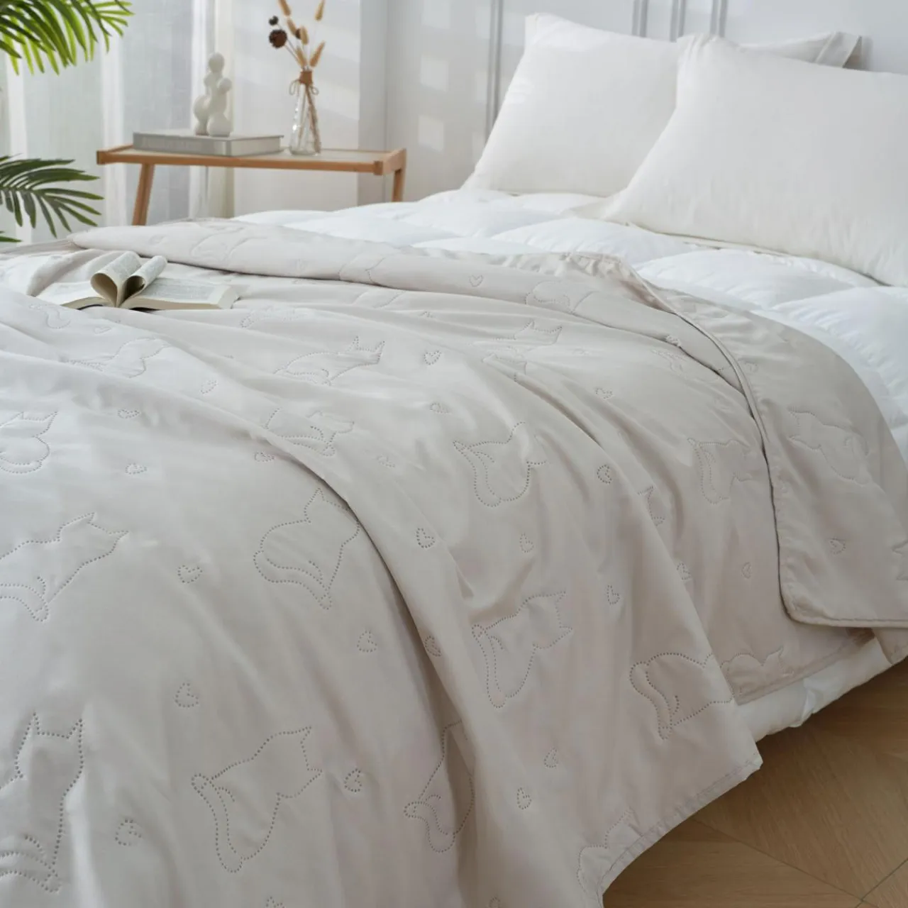 Beżowa narzuta na łóżko DABU zwróci uwagę wzorem w koty. Dekoracja doda aranżacji przytulnego, relaksującego akcentu.