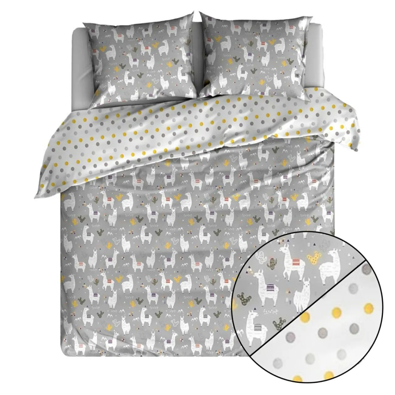 Dwustronna pościel bawełniana ALPAKA, zapinana na zamek błyskawiczny, zapewni komfort i trwałość podczas jej użytkowania.Zabawny deseń tkaniny będzie ozdobą każdego pokoju młodzieżowego lub sypialni, wywołując uśmiech na twarzy domowników. W skład zestawu wchodzi: 1 poszwa 160×200 cm i 2 poszewki 70×80 cm.