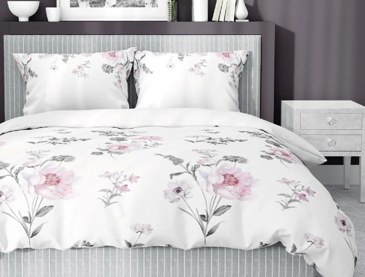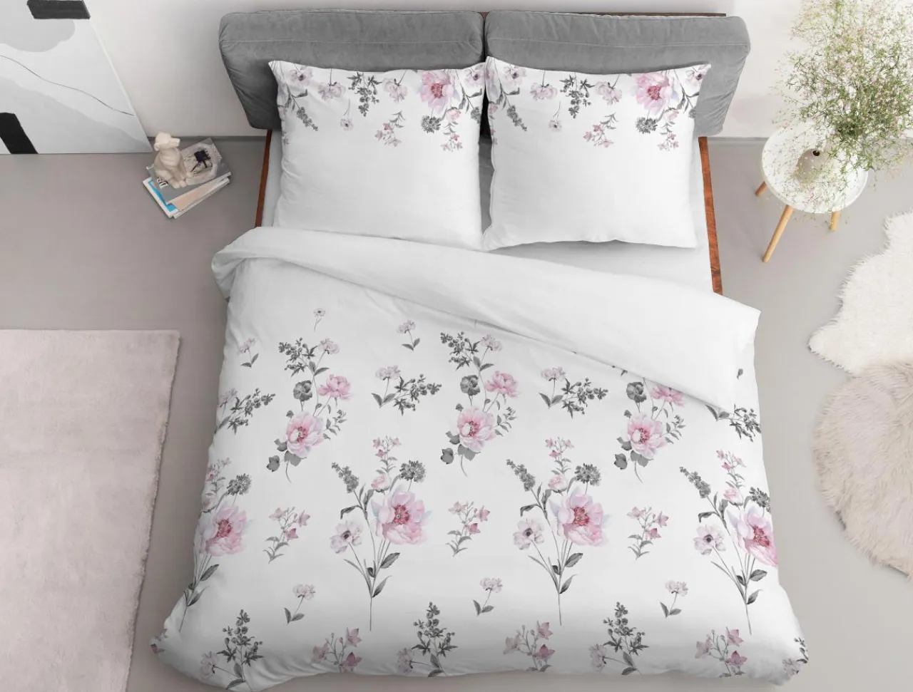 A może biała bawełniana pościel w delikatne różowe kwiaty?