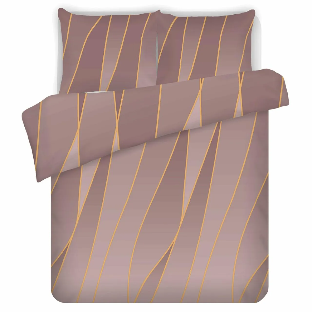 Urządzasz sypialnię w kobiecym stylu i szukasz pościeli? Mamy dla Ciebie komplet w kolorze brudnego różu z ukośnymi pasami w złotym odcieniu.