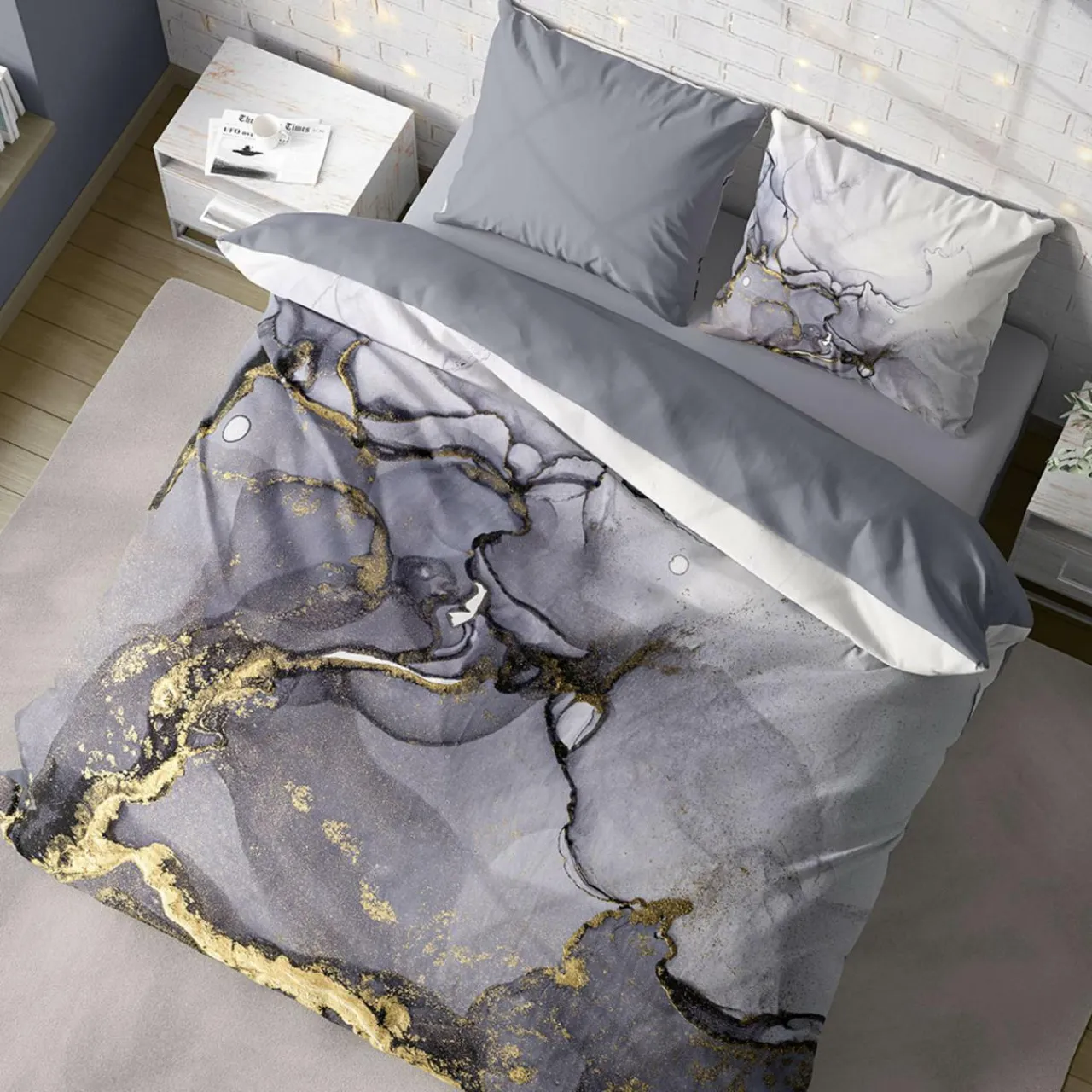 - Rewers pościeli jest jednobarwny, w odcieniu szarości;