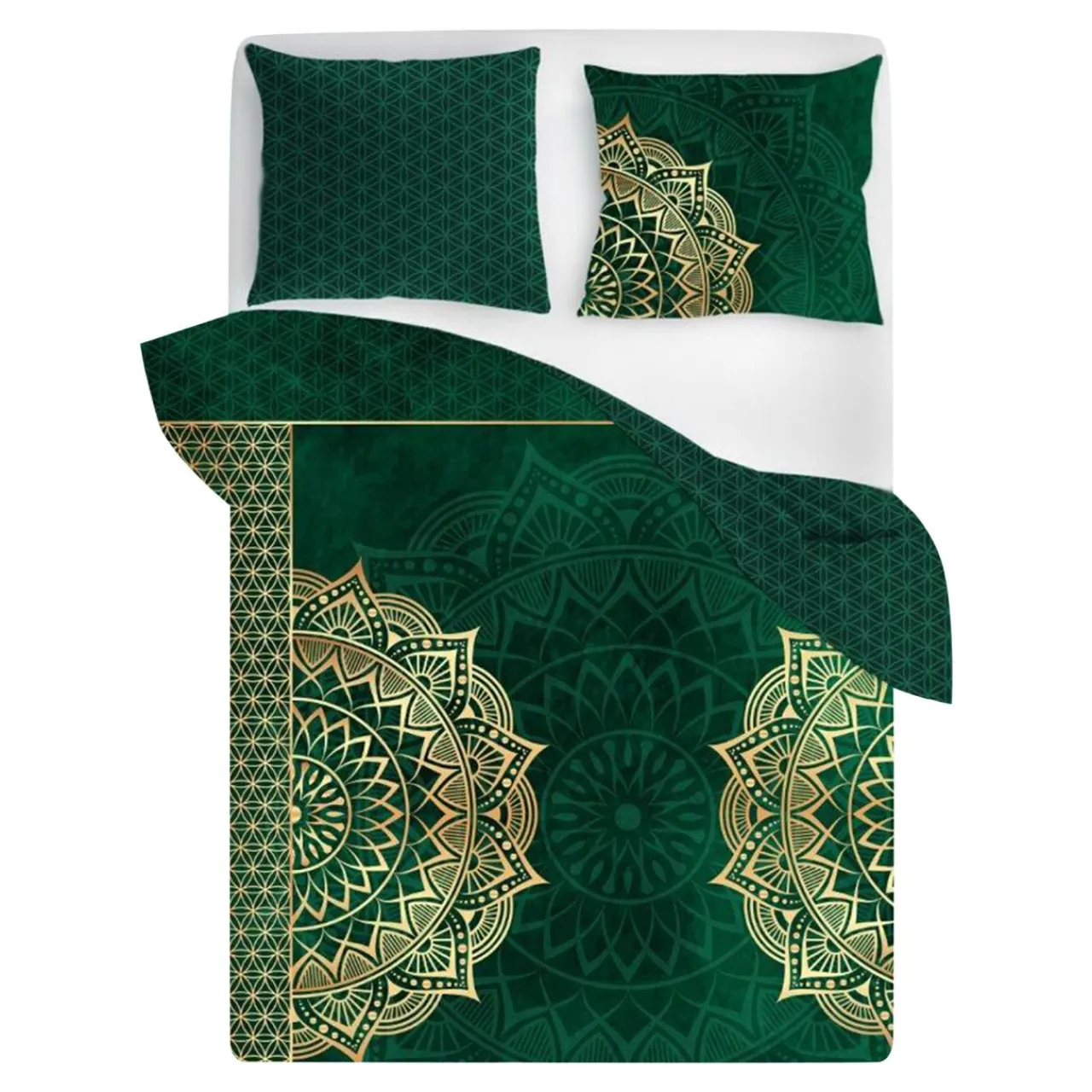 Piękny wzór, zielony kolor przełamany złotym nadrukiem MANDALI a przede wszystkim wykonanie z wysokiej jakości przędz o satynowym splocie, pościeli pomogą się zrelaksować i zapaść w głęboki sen.