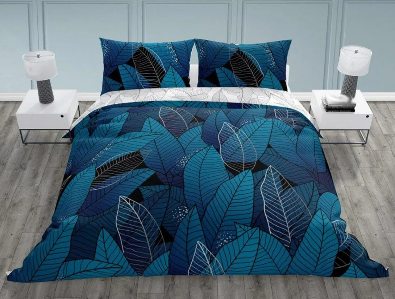 - Pościel jest dwustronna. Przód ma kolor niebieski, który jest ozdobiony wzorem liści, natomiast na rewersie nadrukowany jest szkic liści na białym tle.