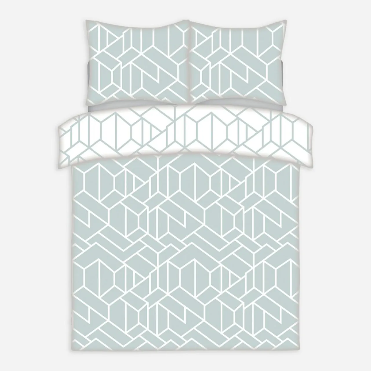 - Biały, geometryczny rysunek na miętowym tle wprowadzi do sypialni lekkość i orzeźwienie.