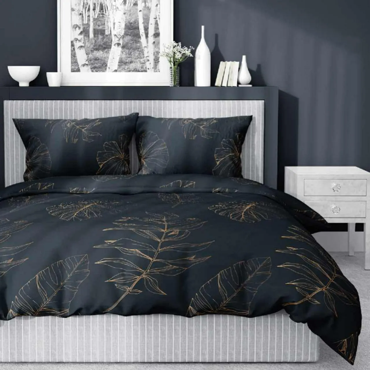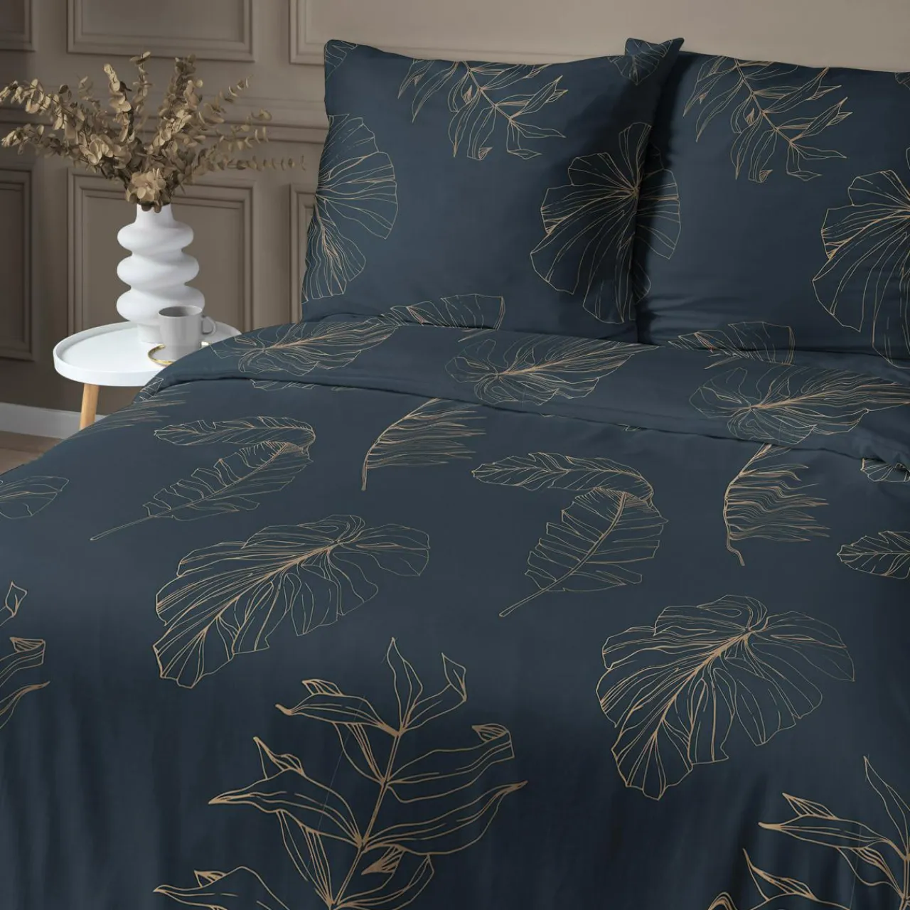 - Pościel w liście HOME SATIN pasuje do sypialni w stylu industrialnym oraz glamour.