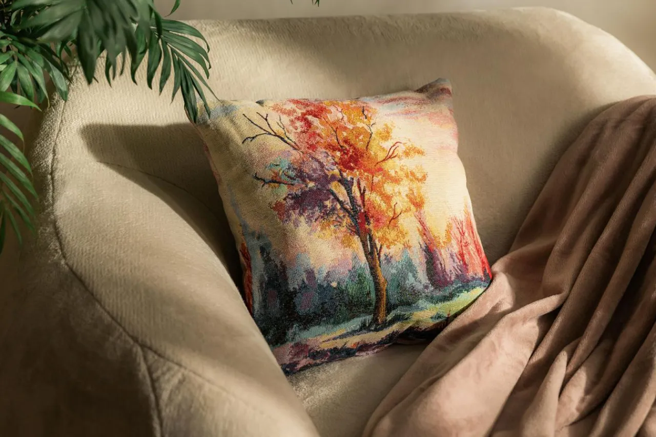 Na poduszce zobaczysz rozciągający się las i jedno okazałe drzewo, które zachwyca paletą kolorów. Przenieś się myślami do klimatycznych jesiennych wieczorów.