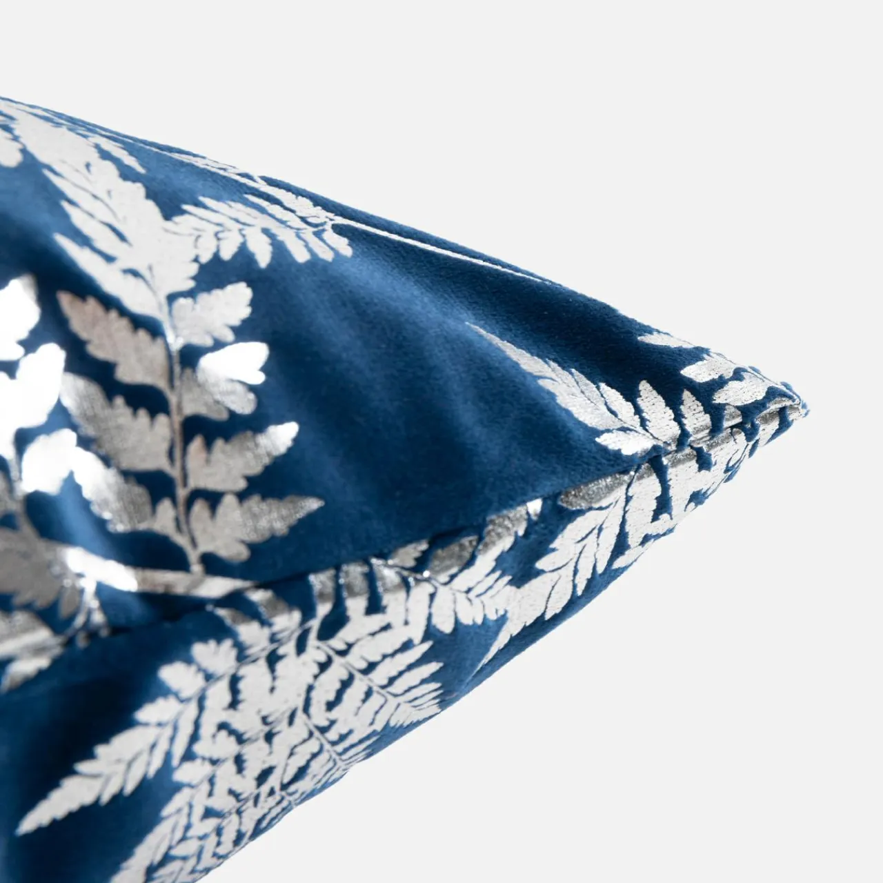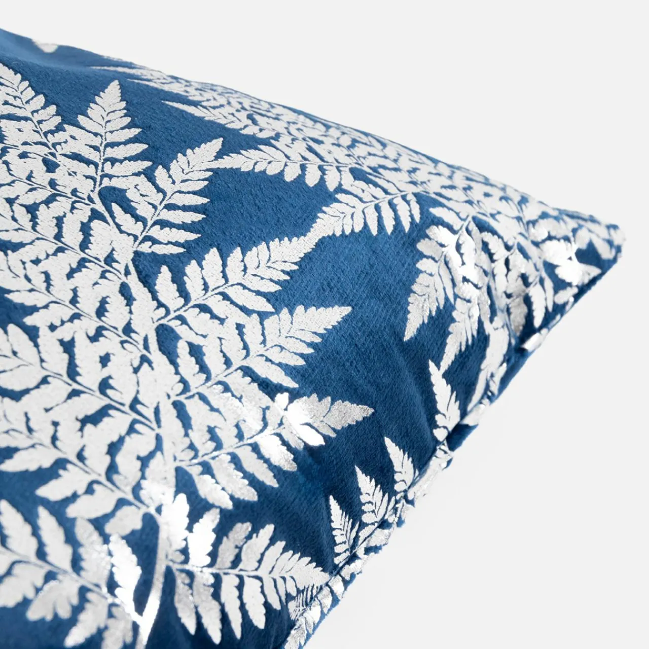 Tło poszewki ma ciemnoniebieski kolor – pasuje do kremowej lub musztardowej sofy.