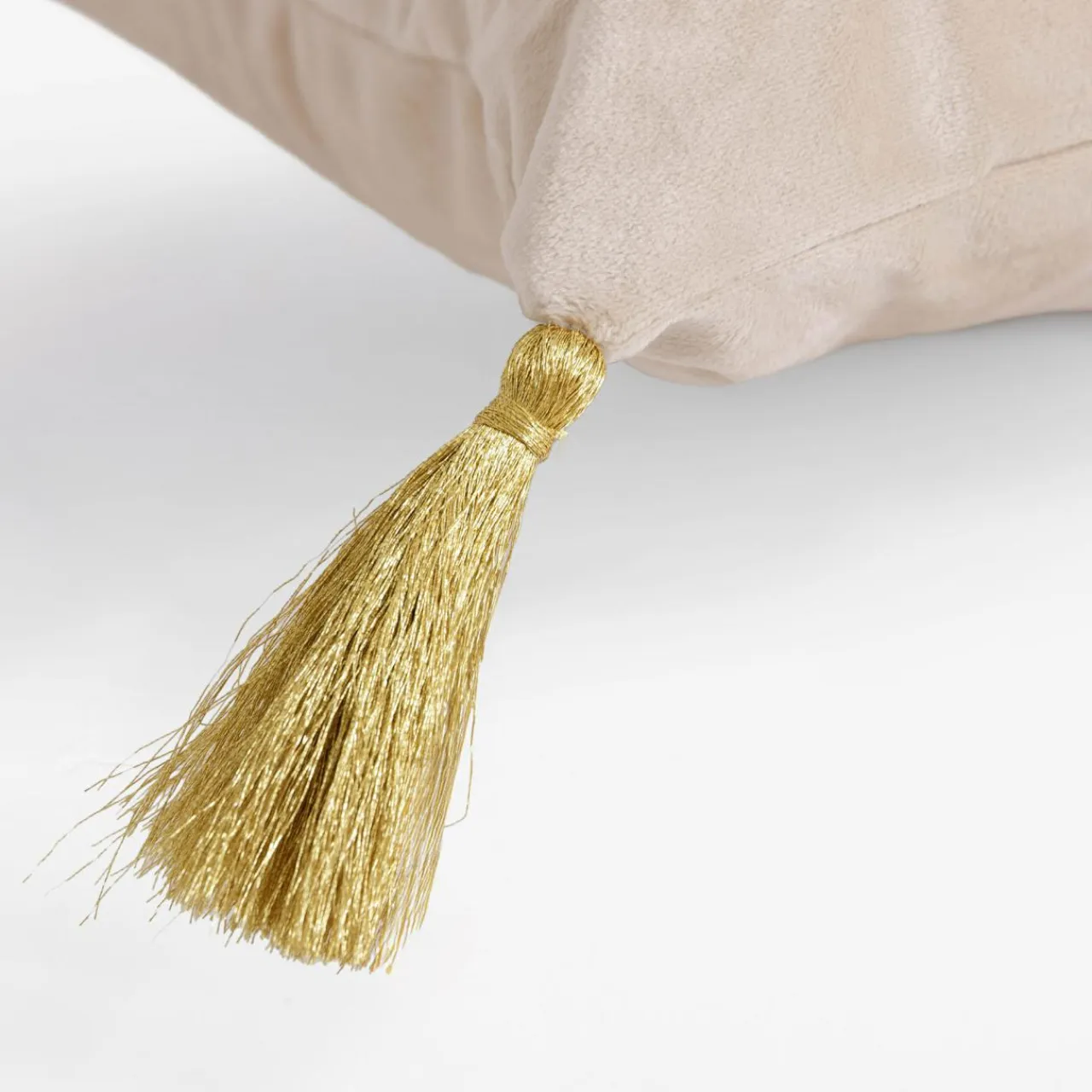 Gładka tkanina lekko się mieni, rogi poszewki są ozdobione złotymi chwostami.
