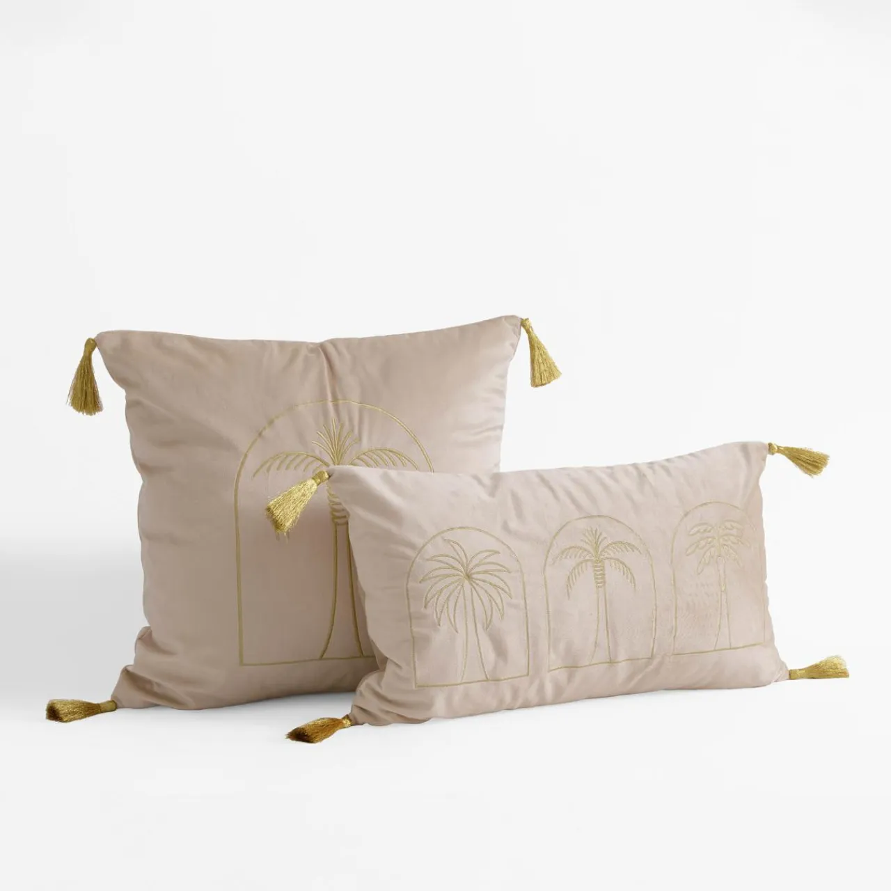 Welurowa poszewka DJERBA ze wzorem złotej palmy podkreśli aranżację o egzotycznym klimacie.